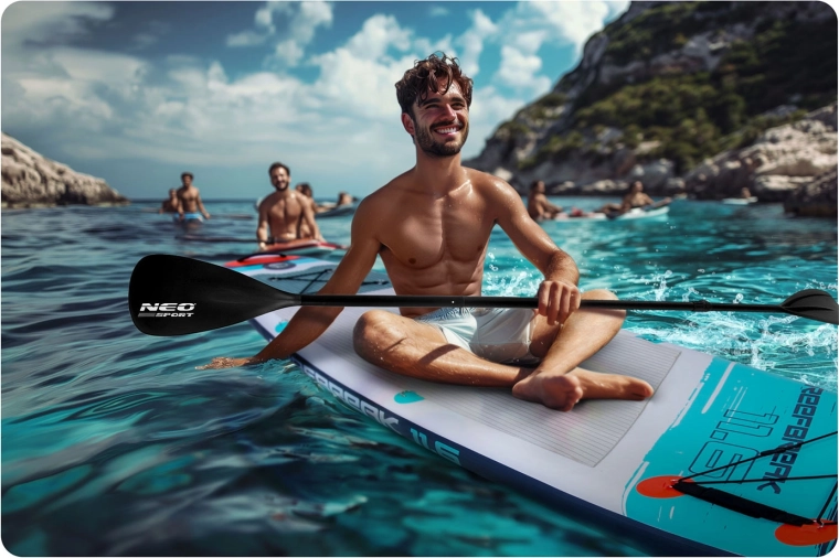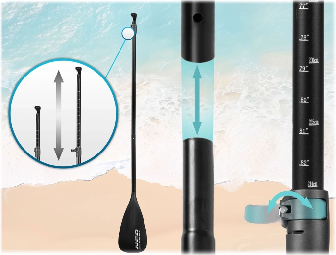 De universele 2-in-1 peddel voor SUP NEO-SPORT biedt een verstelbare lengte tot 230 cm, snel in elkaar te zetten voor eenvoudig transport en de mogelijkheid om te gebruiken als enkelbladige SUP-peddel of dubbelbladige kajakpeddel. De lichte en duurzame constructie van flexibel materiaal zorgt voor comfortabel peddelen voor zowel beginners als gevorderden.
