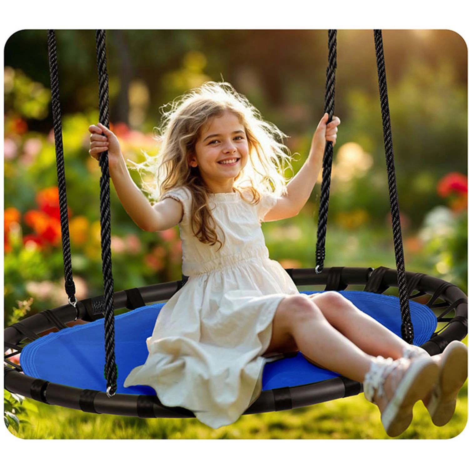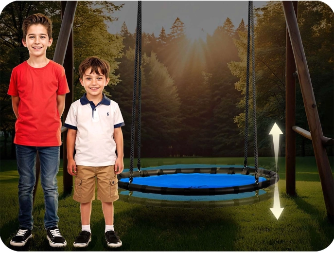 De schommel is voorzien van traploze hoogteverstelling tot 160 cm, zodat je hem eenvoudig kunt aanpassen aan de lengte en leeftijd van het kind – hij groeit met hen mee. Dankzij de grote diameter van 120 cm kunnen één of meerdere kinderen comfortabel schommelen, of neem zelf even pauze – het draagvermogen is tot 150 kg.
