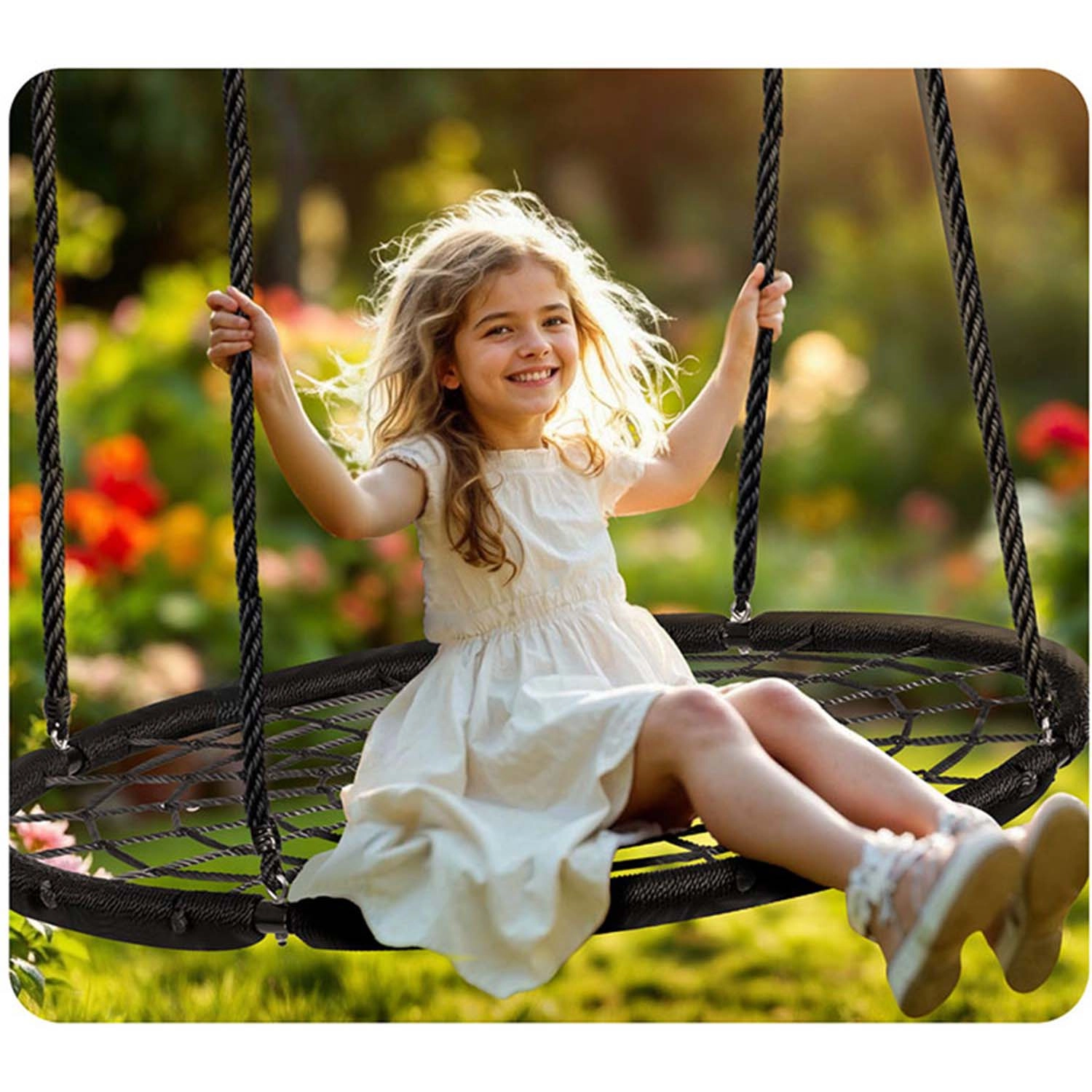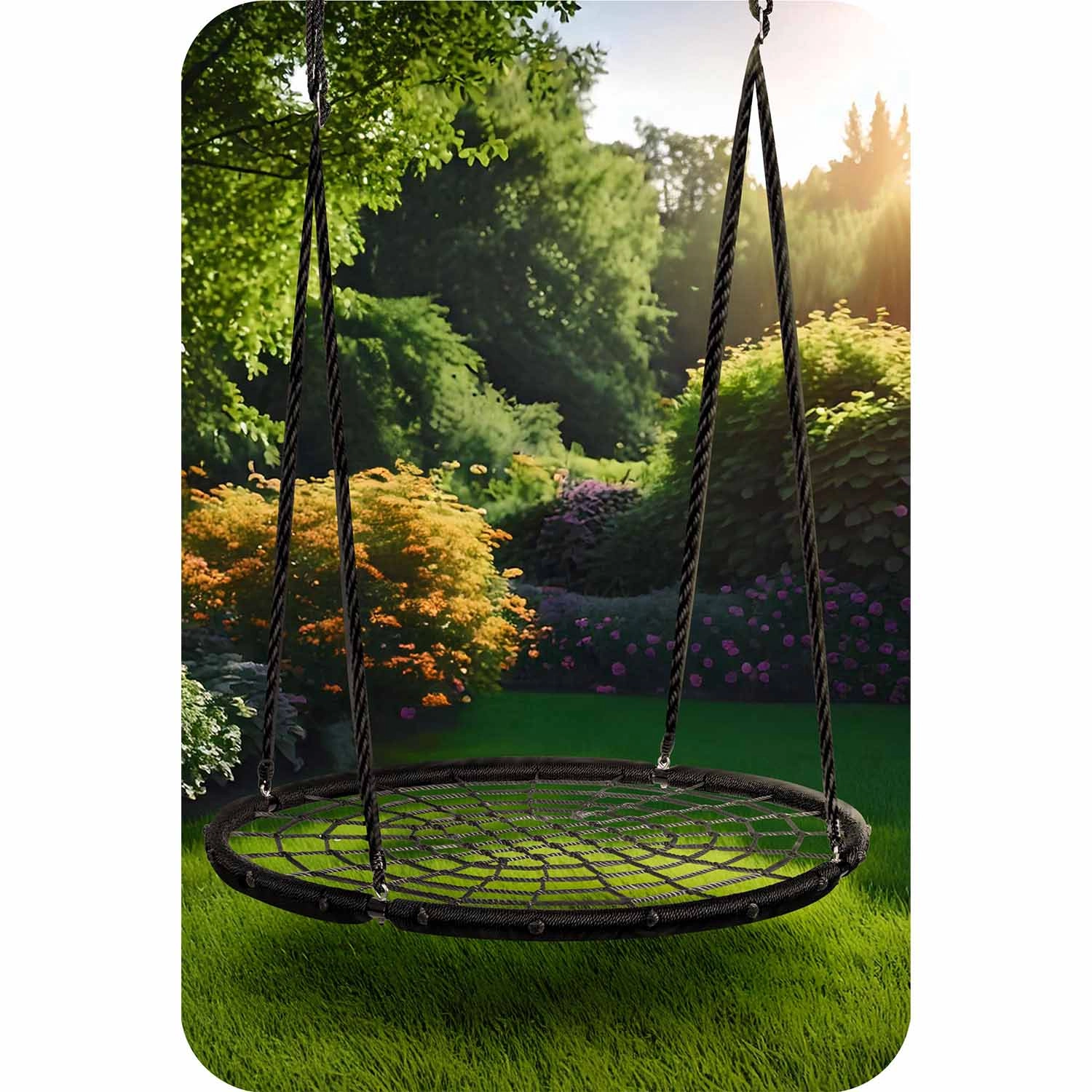 De NEO-SPORT schommel met een diameter van 100 cm is een uitstekende keuze voor tuin, terras en speelplaats. Het robuuste stalen frame met duurzame PE-bekleding en het sterke gevlochten touw in spinnenwebstijl bieden een comfortabele en veilige zit. De materialen zijn weerbestendig, makkelijk te onderhouden en geschikt voor dagelijks plezier.
