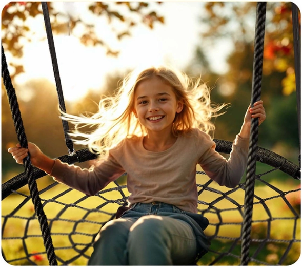 Eenvoudige hoogteverstelling van de ophanging in het bereik van ca. 90–160 cm maakt het mogelijk de schommel aan te passen aan de leeftijd van het kind en de beschikbare ruimte.