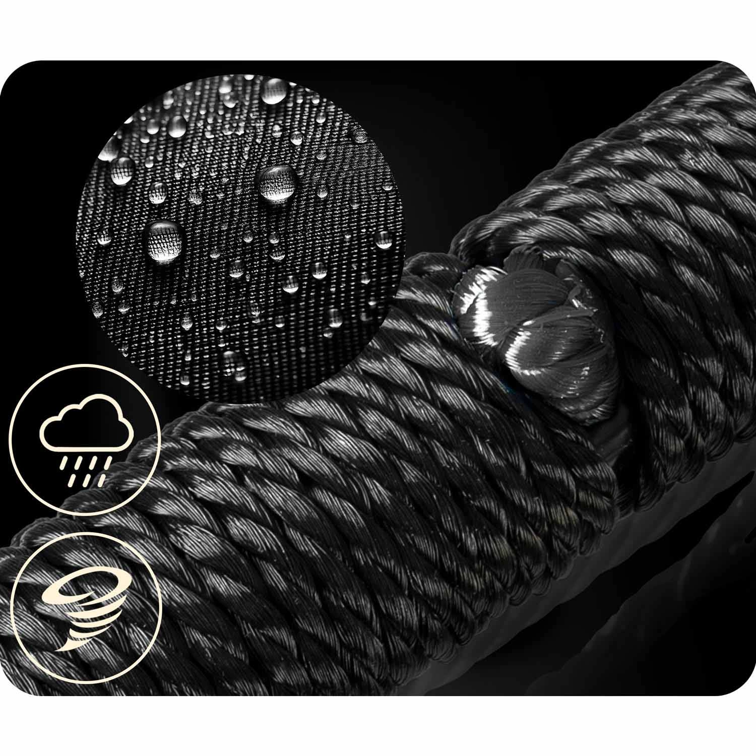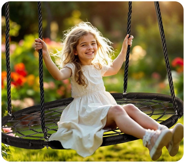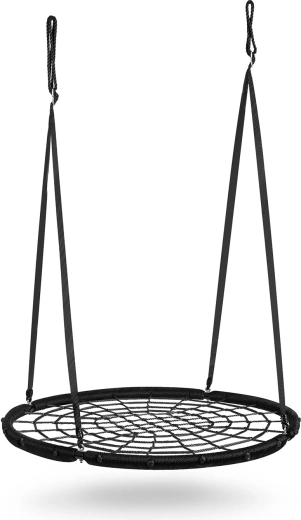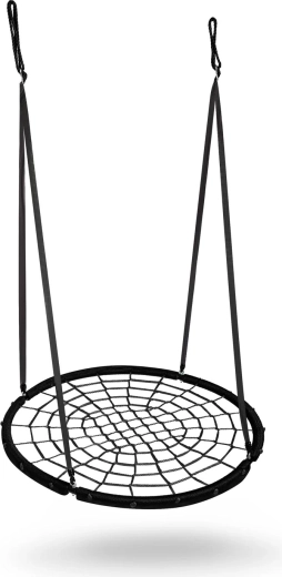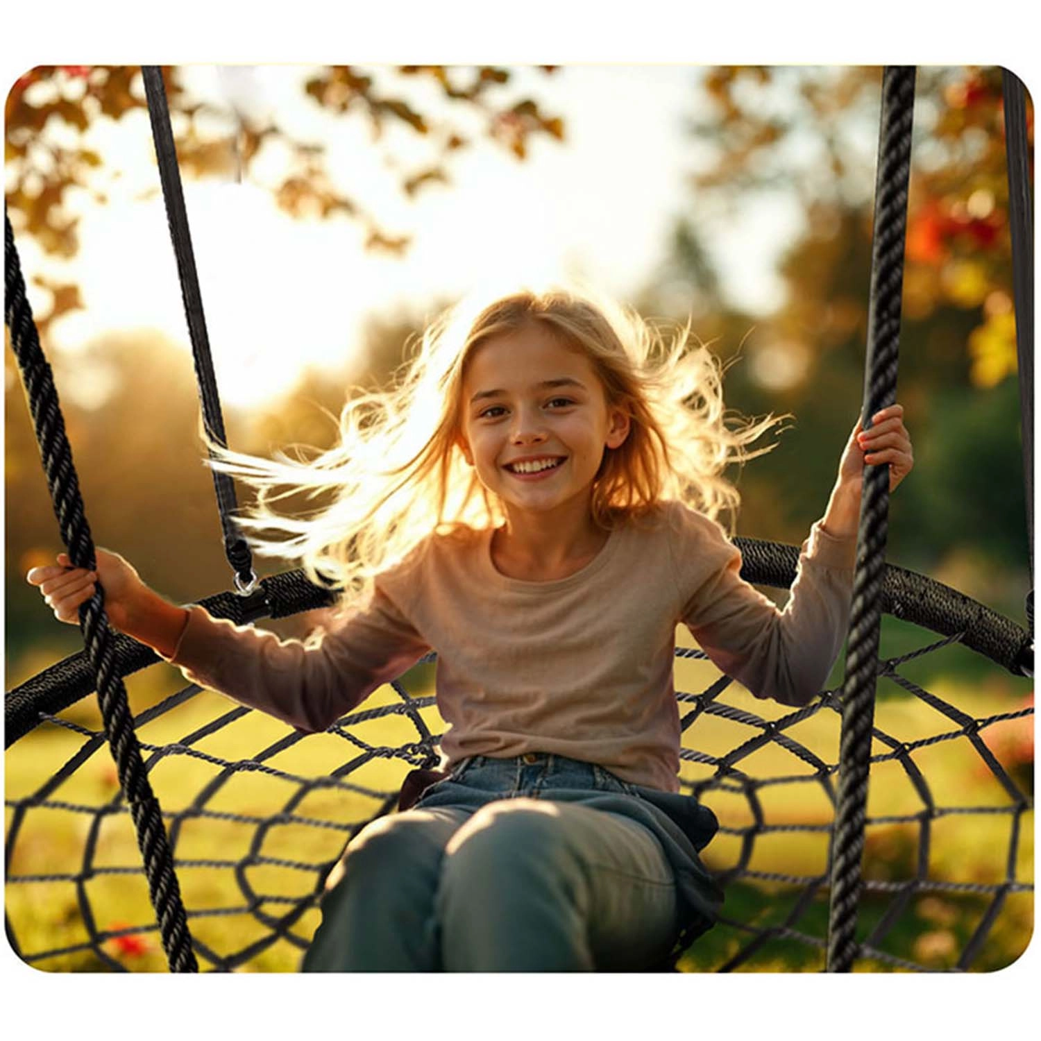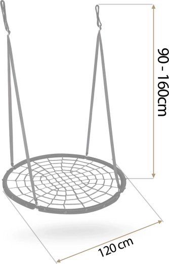 De in hoogte verstelbare ophangtouwen (ca. 90–160 cm) maken het mogelijk de schommel af te stemmen op de leeftijd en lengte van het kind. De ruime zitting met een diameter van 120 cm biedt comfortabel plaats aan meerdere kinderen tegelijk en het draagvermogen tot 150 kg maakt veilig schommelen ook voor volwassenen mogelijk. Ideale oplossing voor tuin, erf of pergola.