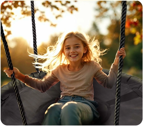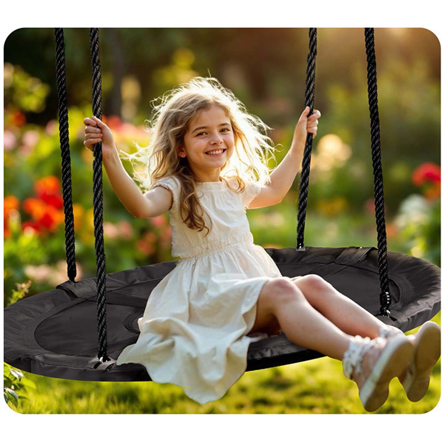 Dankzij de verstelbare ophangtouwen met een maximale lengte van 160 cm pas je de schommelhoogte eenvoudig aan de lengte van het kind en de ophanglocatie aan. Het brede zitvlak is comfortabel om te zitten én liggen, zodat zowel jongere als oudere kinderen – en zelfs volwassenen – kunnen genieten van het schommelen.
