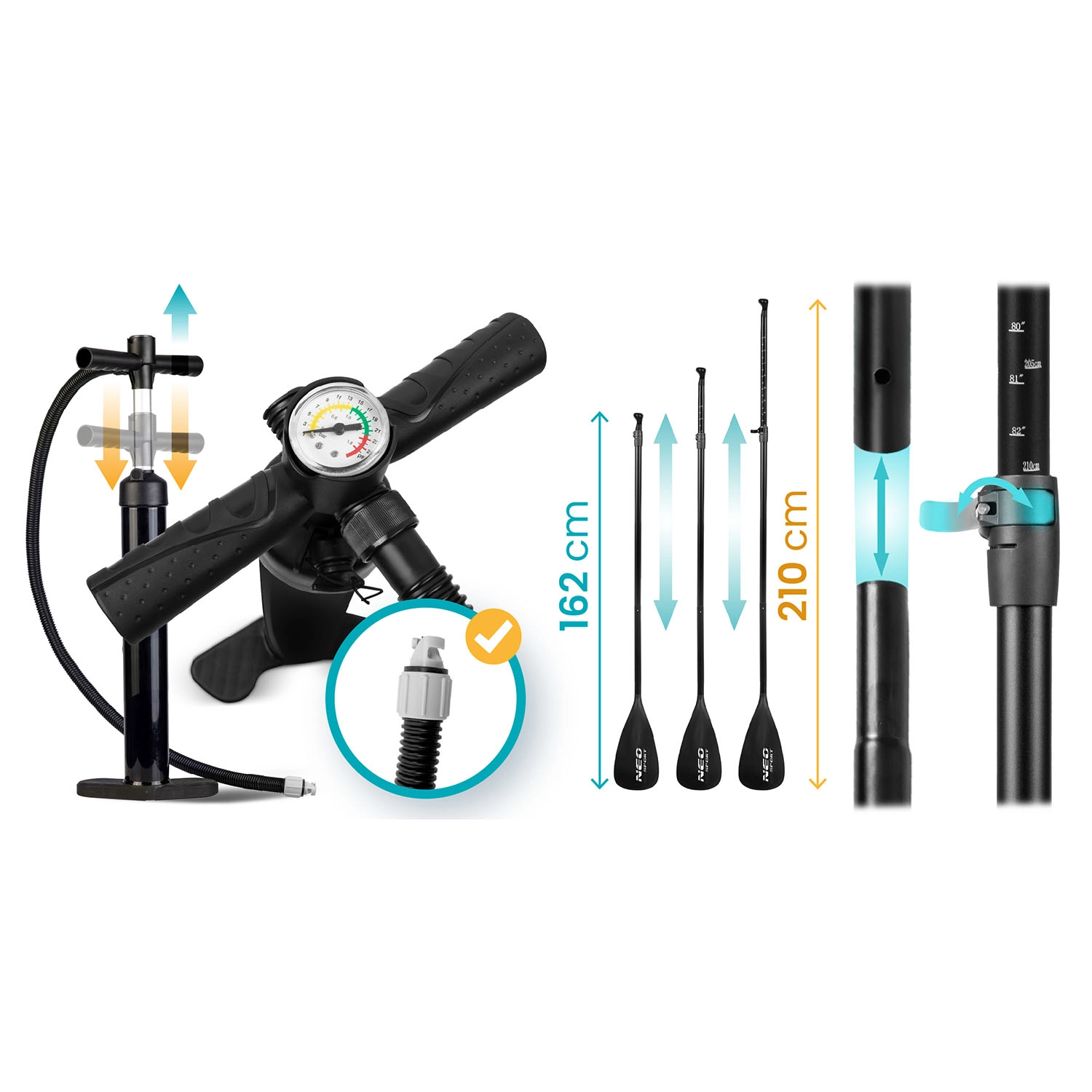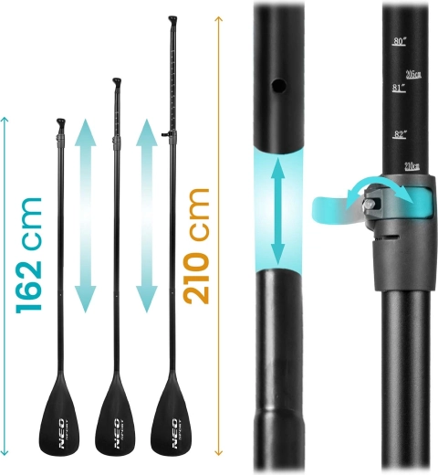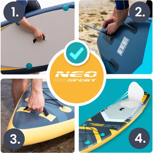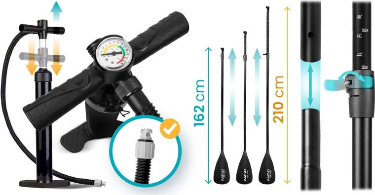 Bijgeleverd zijn een dubbelwerkende pomp met manometer voor snel en veilig oppompen, een verstelbare aluminium peddel (162–210 cm) met snelsluiting en een spiraalvormige leash met draaikoppeling voor bewegingsvrijheid. De duurzame rugzak met slijtvaste versteviging maakt het vervoeren van de complete uitrusting eenvoudig. Een UV-bestendig oppervlak en versterkte randen verlengen de levensduur, zelfs bij intensief gebruik.