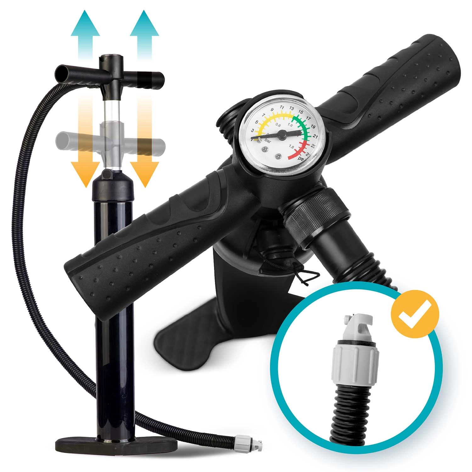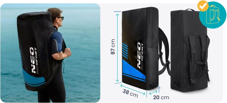 Het lichte ontwerp, meerdere draaggrepen en de duurzame rugzak maken comfortabel dragen mogelijk. De dubbelwerkende pomp verkort de oppomptijd zodat je snel het water op kunt.