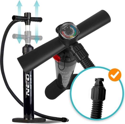 Alles wat je nodig hebt in één pakket: verstelbare aluminium peddel 162–210 cm, dubbelwerkende pomp met manometer, veiligheidsleash, afneembare vin, reparatieset en stevige transport rugzak.