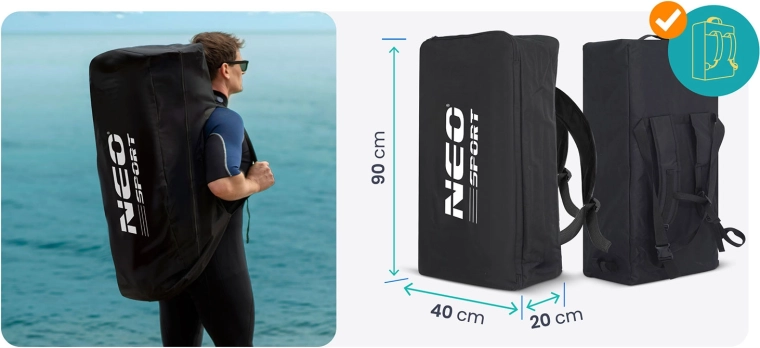 In de doos vind je alles voor een directe start: een verstelbare aluminium peddel (162–210 cm), een dubbelwerkende pomp met manometer, een veiligheidsleash, een afneembare vin, een reparatieset en een stevige transport rugzak. De voorste cargo‑bungee maakt het mogelijk een rugzak of jas vast te zetten, handige handgrepen vergemakkelijken het dragen en het UV‑bestendige oppervlak beschermt tegen de zon.