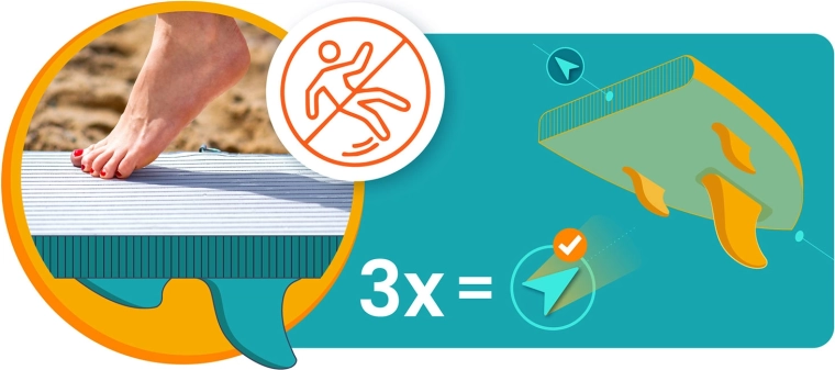De antislip EVA‑pad biedt uitstekende grip, zelfs op blote voeten, en de drie vinnen verbeteren de koersvastheid en wendbaarheid. Resultaat? Zelfverzekerd varen, ook voor beginners.