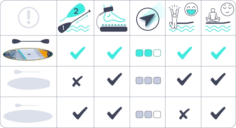 • Veelzijdig gebruik: vlak water, kleine golven, conditiepeddelen, tochten en yoga.