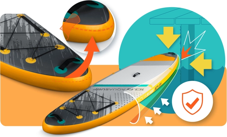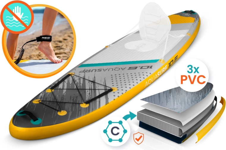 De opblaasbare SUP AQUASURF 10'6 (320 cm) is een uitstekende keuze voor zowel beginners als gevorderde paddlers. De brede, 15 cm dikke constructie van Drop Stitch Light en 3‑laags PVC zorgt voor stevigheid, stabiliteit en een lange levensduur. De antislip EVA‑trakciepad geeft zekerheid, zelfs met natte voeten, terwijl 3 stabiliserende vinnen het rechtuit varen en manoeuvreren vergemakkelijken.