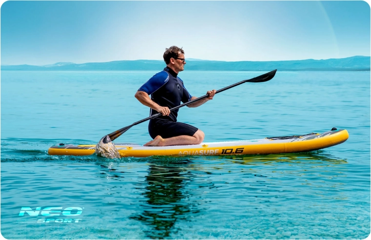 Ontdek het veelzijdige opblaasbare paddleboard AQUASURF 10'6, dat hoge stabiliteit, eenvoudige besturing en een complete set accessoires in het pakket biedt. Dankzij de antislip EVA‑deklaag, 3 vinnen en een draagvermogen tot 140 kg is hij ideaal voor vlak water, kleine golven, ontspanning en yoga. Snel dubbelwerkend oppompen met manometer en een verstelbare aluminium peddel zorgen voor een comfortabele start op het water, waar je ook bent.