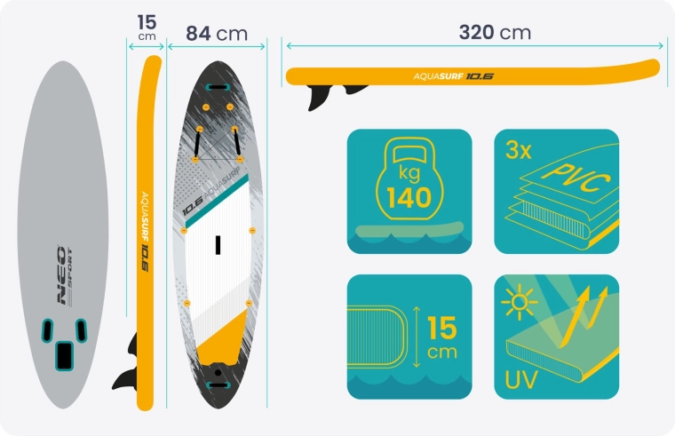 Opblaasbaar paddleboard AQUASURF 10'6 (320 × 84 × 15 cm) met Neo‑Sport set