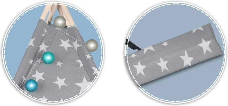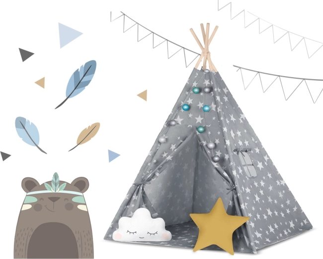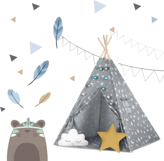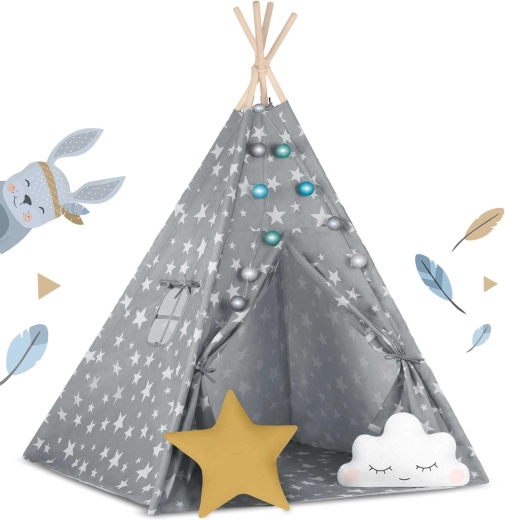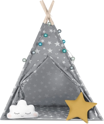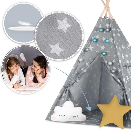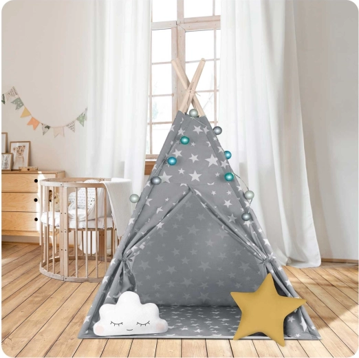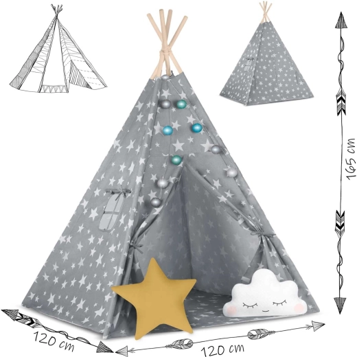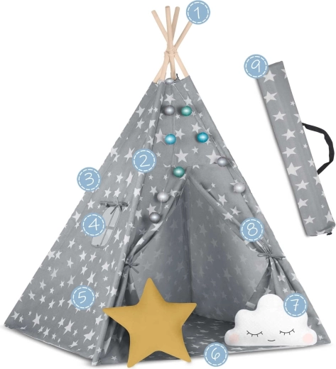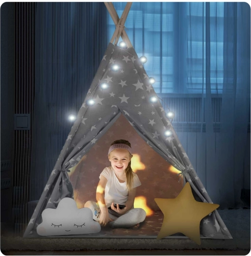 In de set zit alles wat je nodig hebt: 4 grenen stokken, een stabilisator voor extra stevigheid, LED-lichtjes (op batterijen), een ingenaaide vloer, 2 zachte kussentjes in de vorm van een wolkje en een ster, een raampje met rolgordijn en een praktische draagtas. De tipi is gemakkelijk op te zetten en te verplaatsen – perfect voor de kinderkamer, speelhoek of in de tuin in de schaduw.