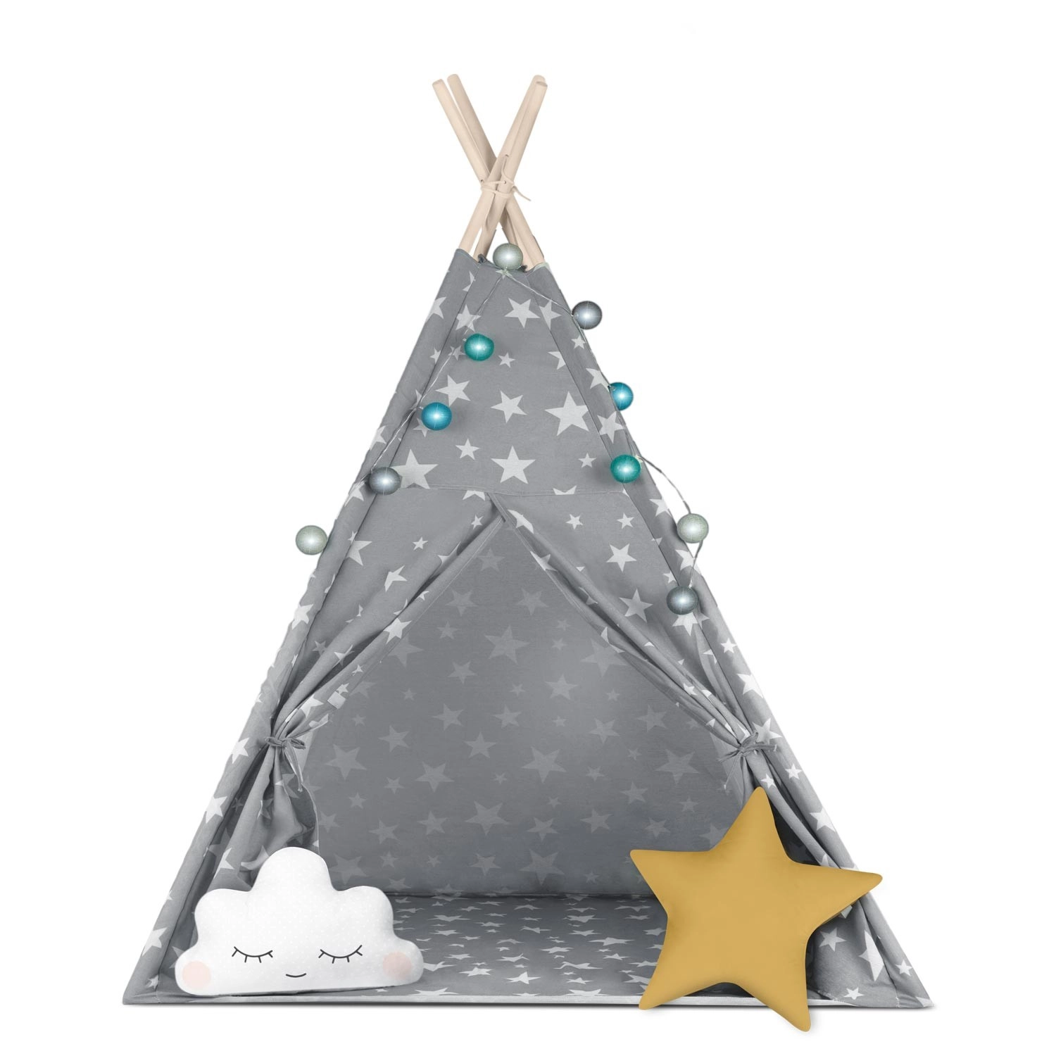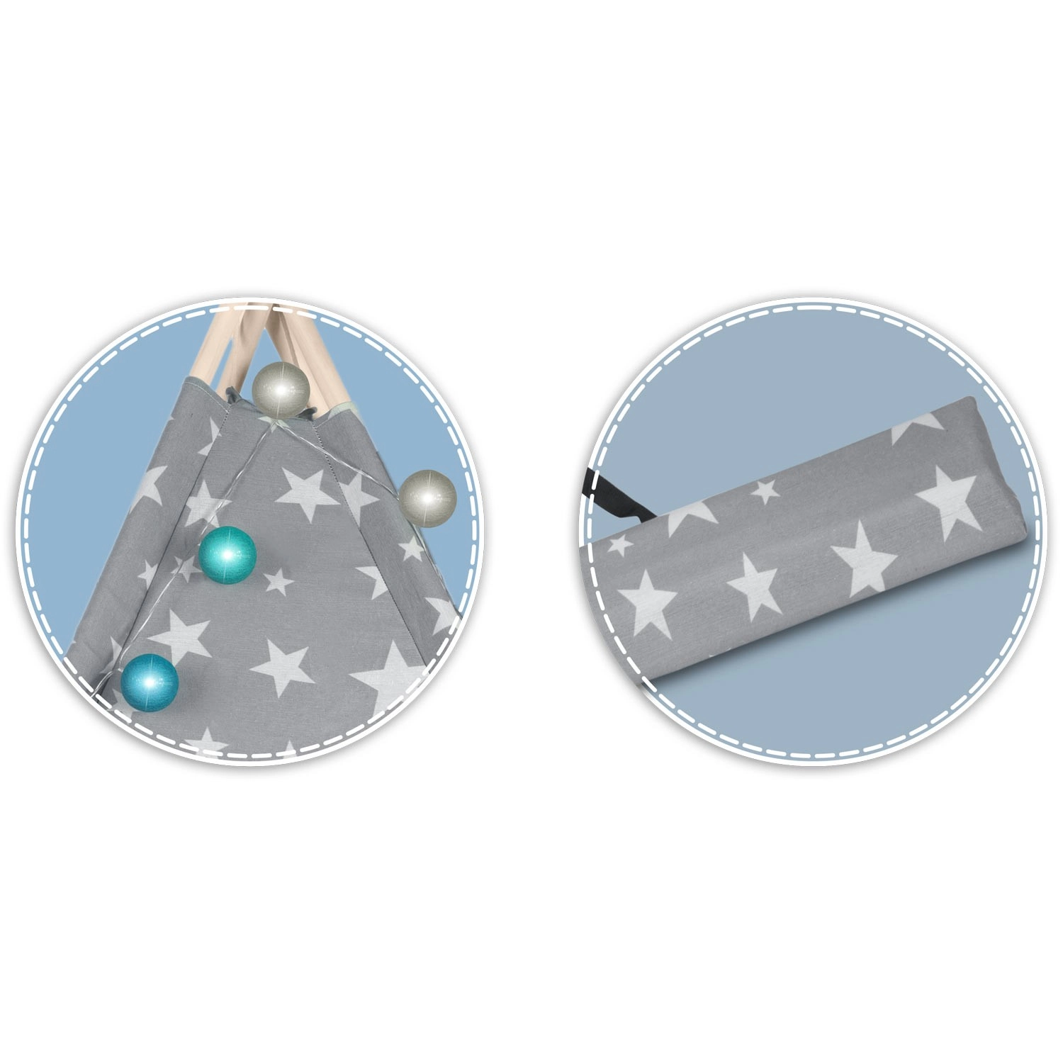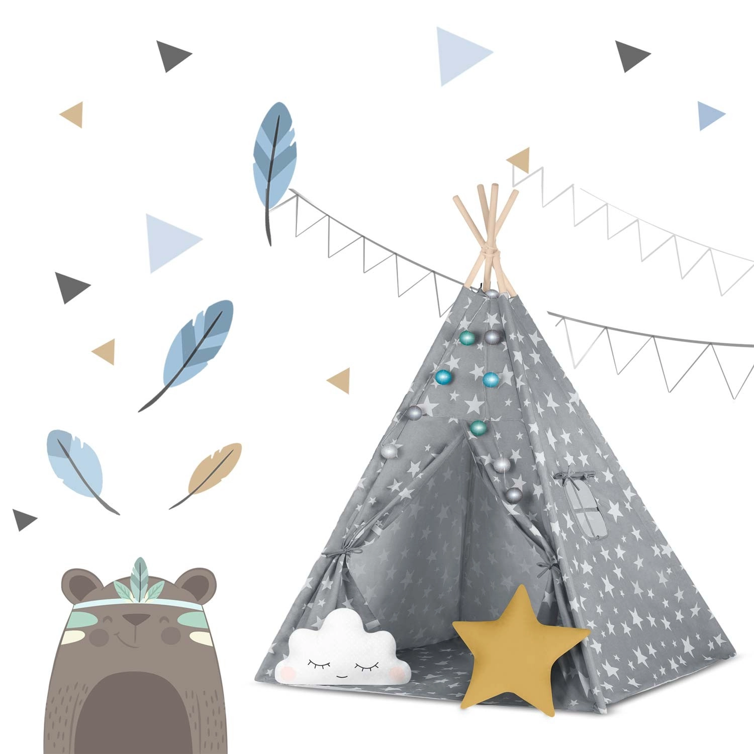 In de set zit alles wat je nodig hebt: 4 grenen stokken, een stabilisator voor extra stevigheid, LED-lichtjes (op batterijen), een ingenaaide vloer, 2 zachte kussentjes in de vorm van een wolkje en een ster, een raampje met rolgordijn en een praktische draagtas. De tipi is gemakkelijk op te zetten en te verplaatsen – perfect voor de kinderkamer, speelhoek of in de tuin in de schaduw.