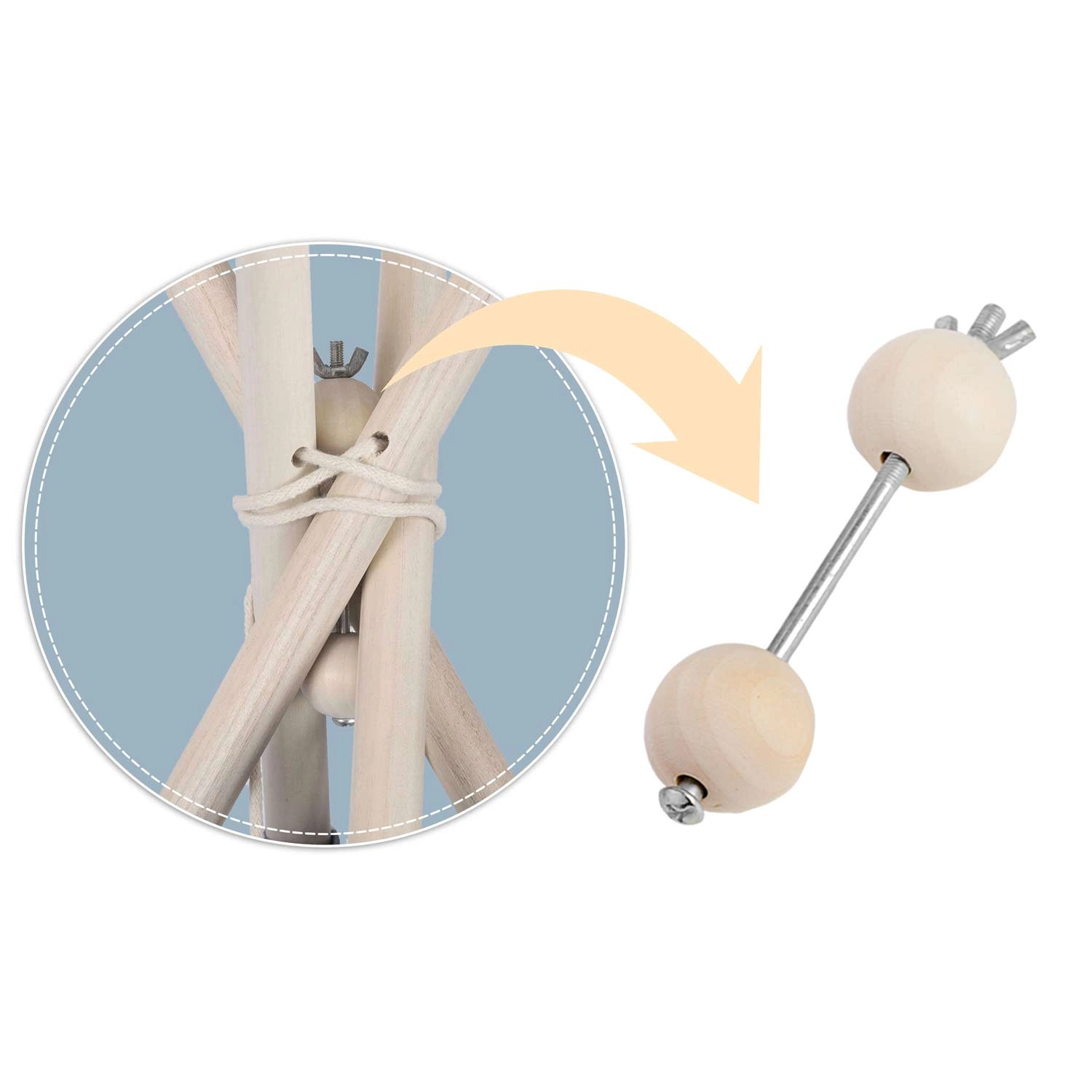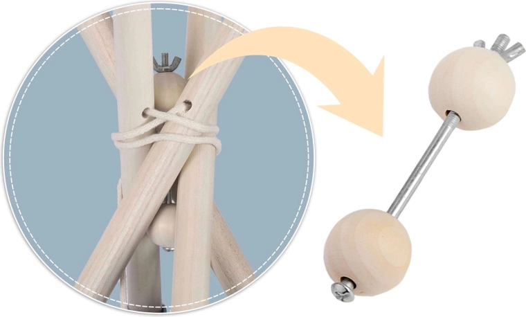 Vier grenen stokken en de meegeleverde stabilisator behouden de vorm van de tipi, verhogen de veiligheid en zorgen voor stevigheid tijdens het spelen.