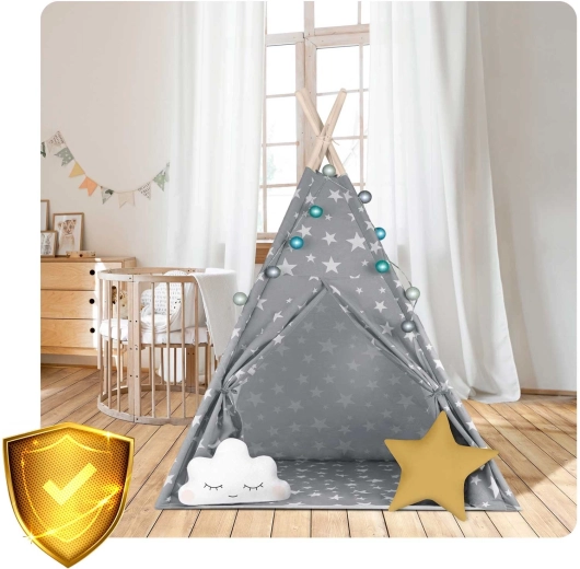 De NUKIDO kindertipi in elegant grijs met sterretjes is ontworpen volgens het Montessori-principe – stimuleert zelfstandigheid, verbeelding en rustige leesmomenten. Natuurlijke materialen en hoogwaardige afwerking bieden veiligheid en comfort, terwijl licht en ademend premium katoen de hele dag door voor een aangename omgeving zorgt.