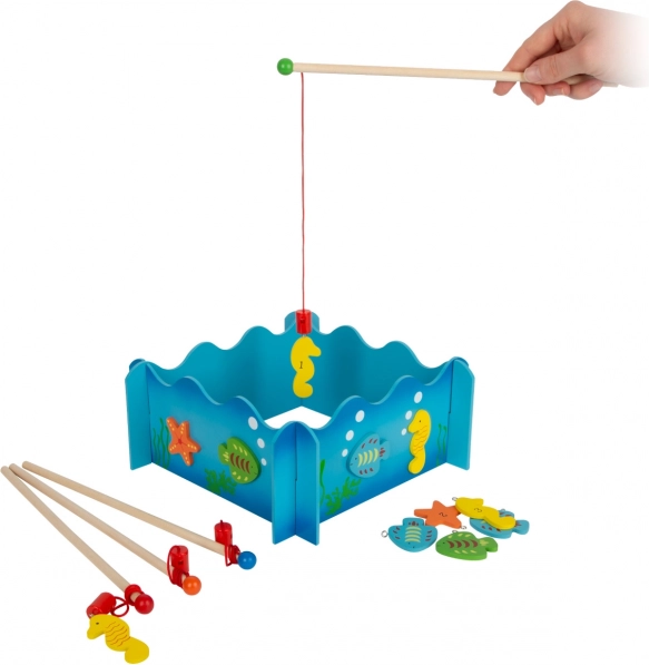Kinderen vangen kleurrijke visjes en zeepaardjes met houten hengels met een magneet. Eenvoudig principe, veel plezier en training van de fijne motoriek.