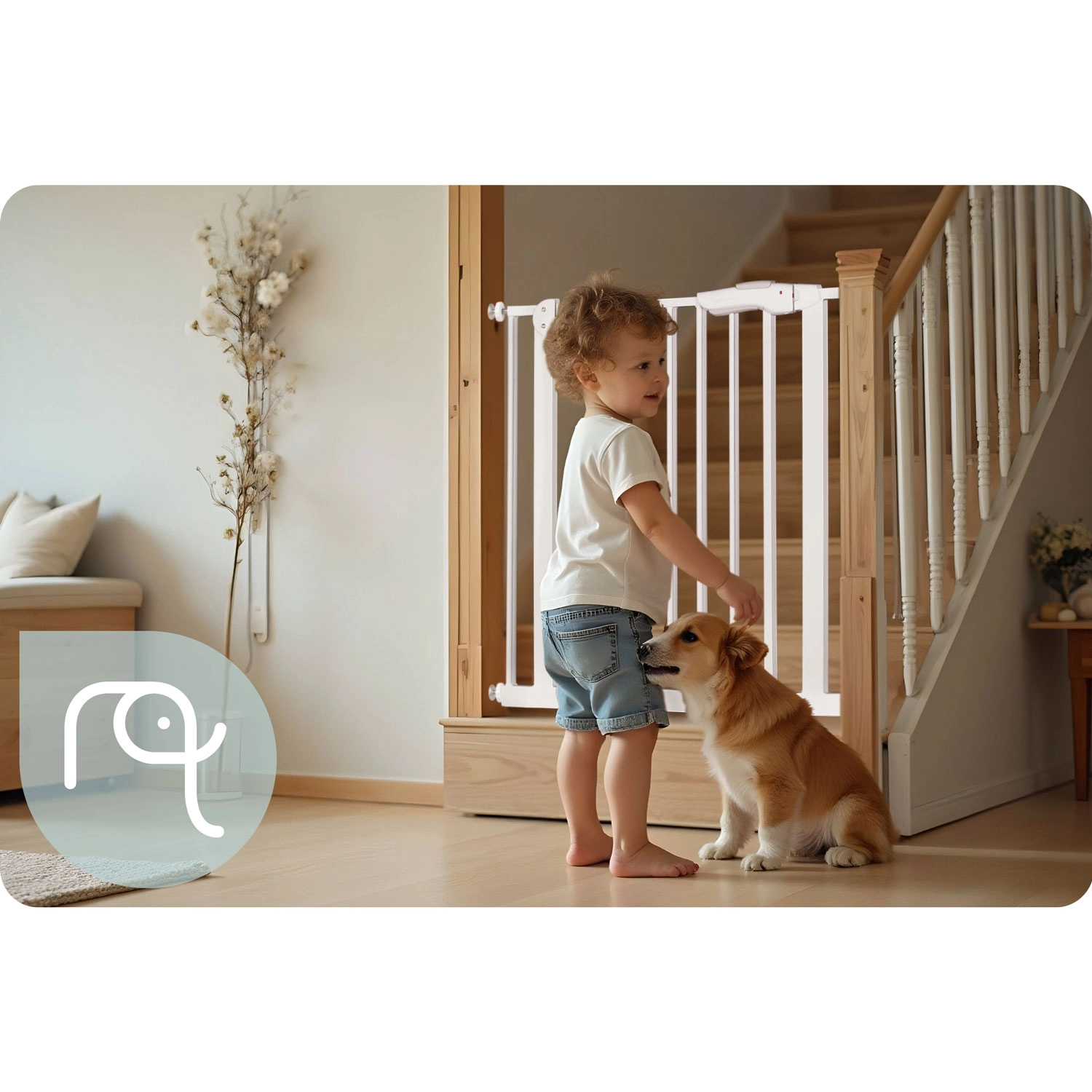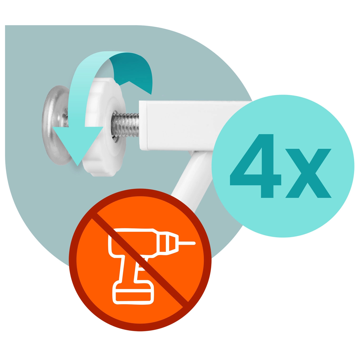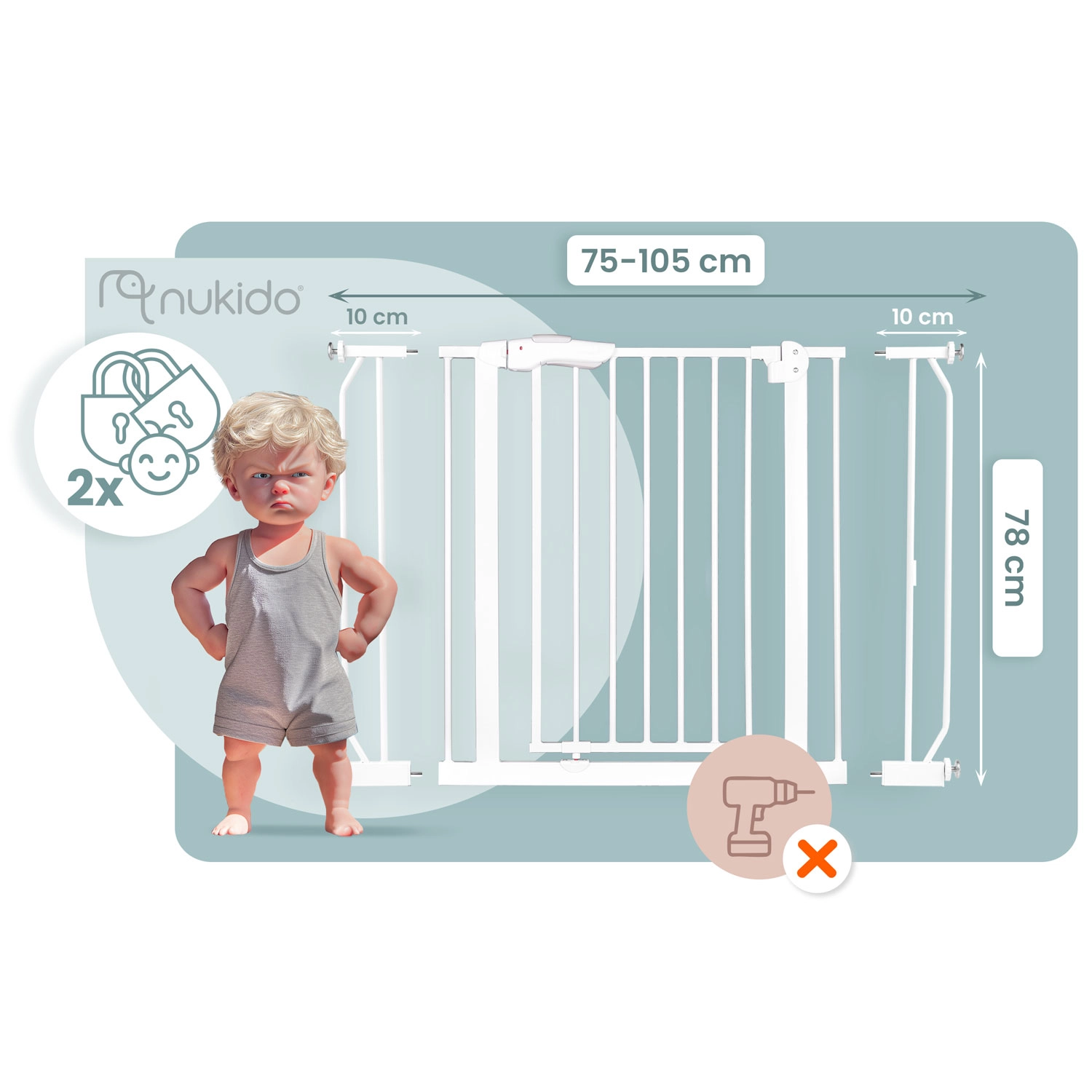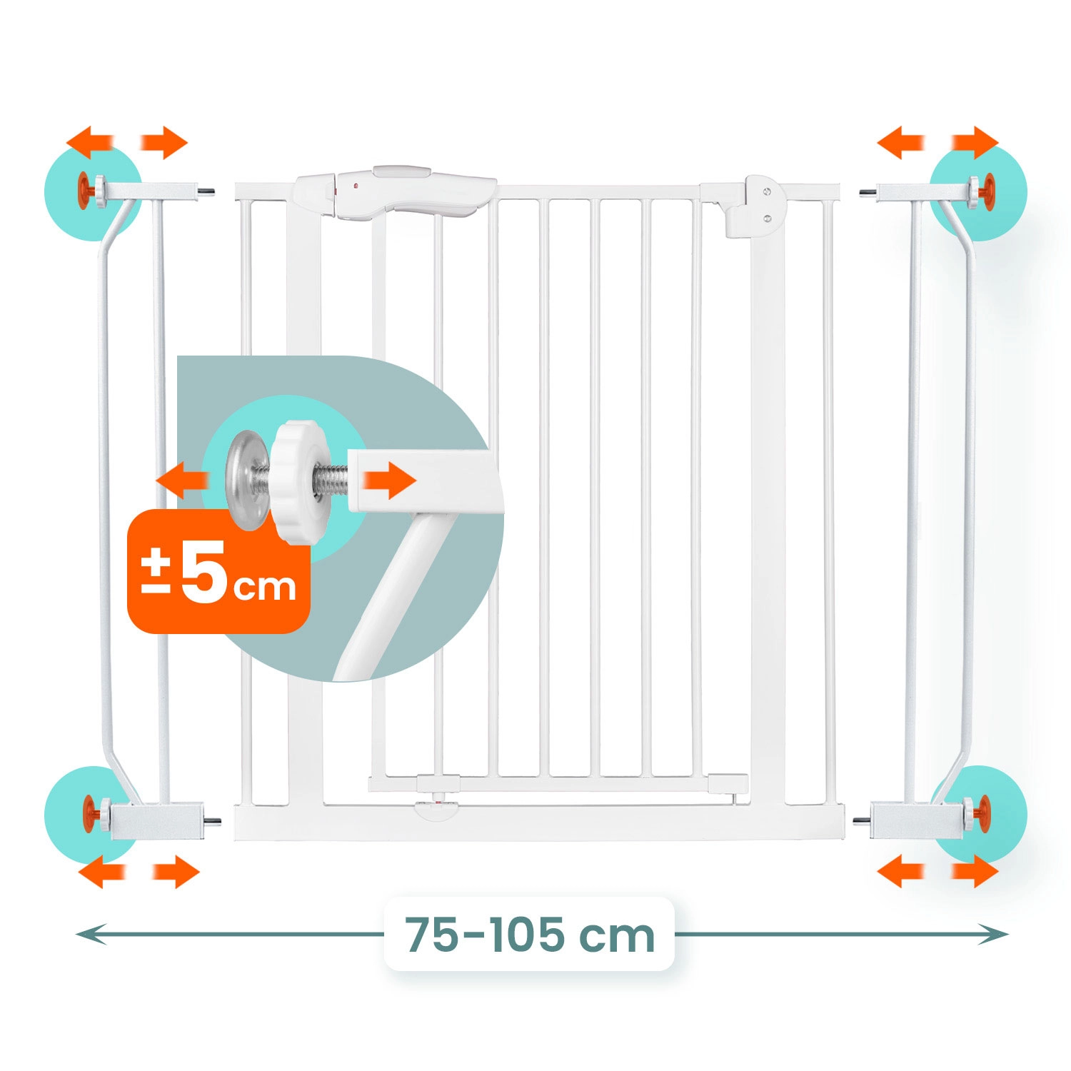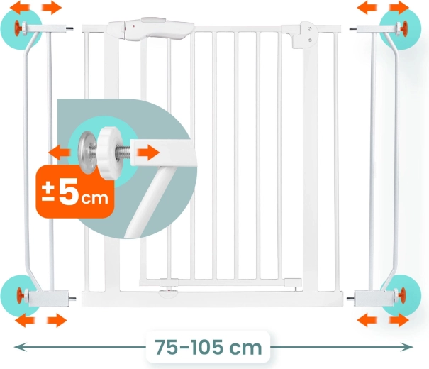 In de verpakking zitten verlengstukken en breedteregelaars, waarmee u de barrière eenvoudig instelt voor doorgangen met een breedte van 75–105 cm. Ideaal voor deuren en aan het begin of einde van trappen.