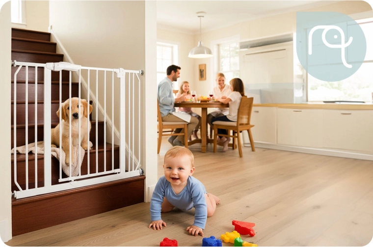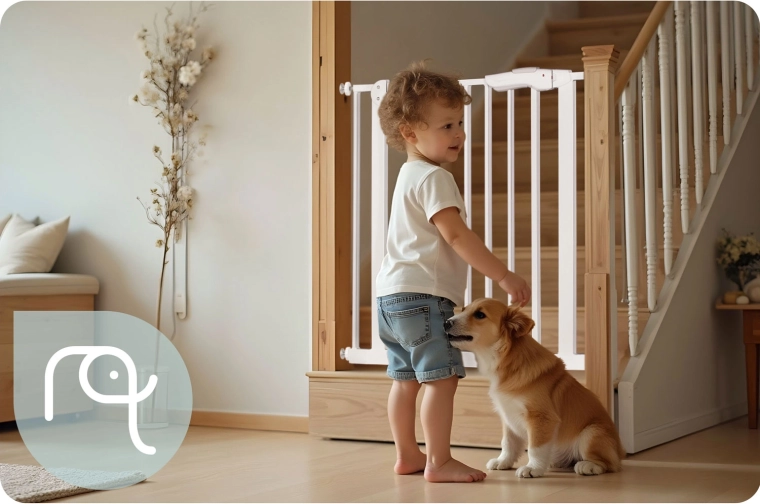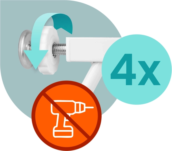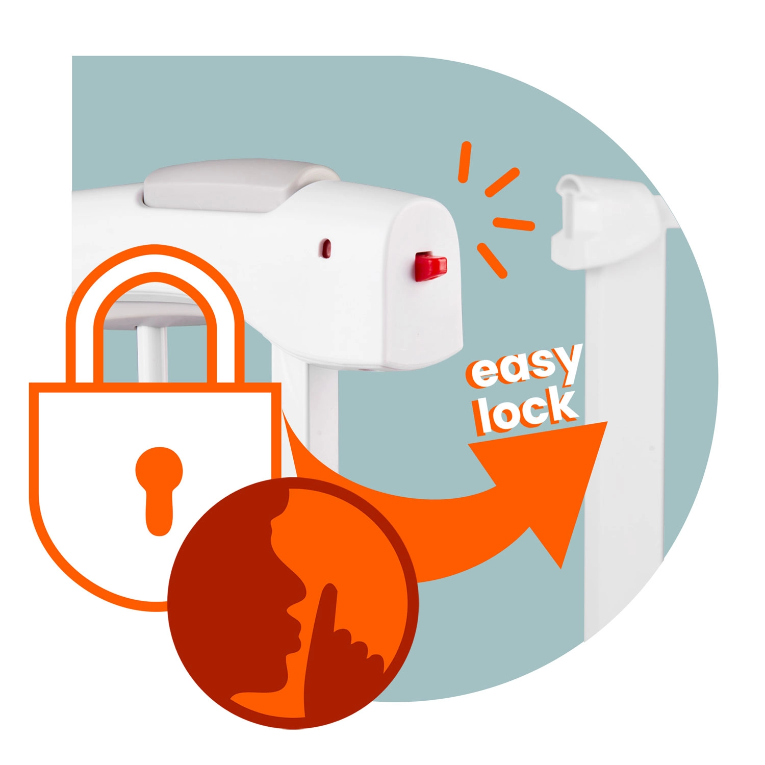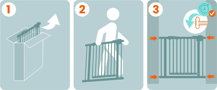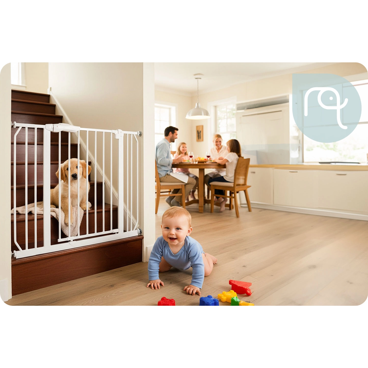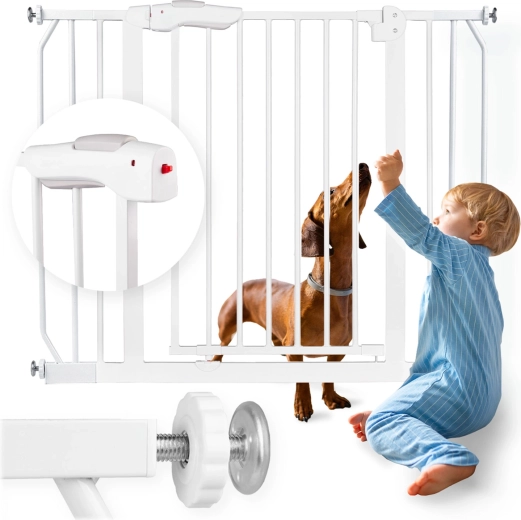 In de verpakking zitten verlengstukken en breedteregelaars, waarmee u de barrière eenvoudig instelt voor doorgangen met een breedte van 75–105 cm. Ideaal voor deuren en aan het begin of einde van trappen.