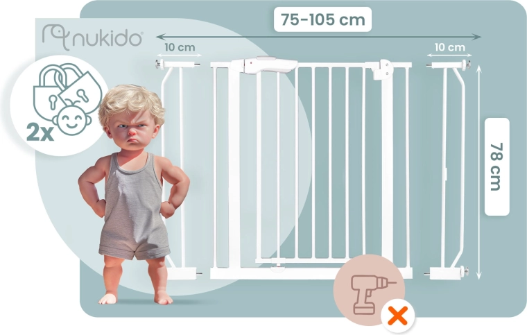 De NUKIDO-veiligheidsbarrière in elegant wit past in de meeste interieurs en dankzij de klembevestiging installeert u haar binnen enkele minuten – zonder de muur of het kozijn te beschadigen. De robuuste metalen uitvoering en de EN 1930:2011-certificering zorgen voor betrouwbare bescherming van kinderen en kleinere huisdieren.