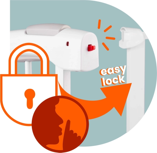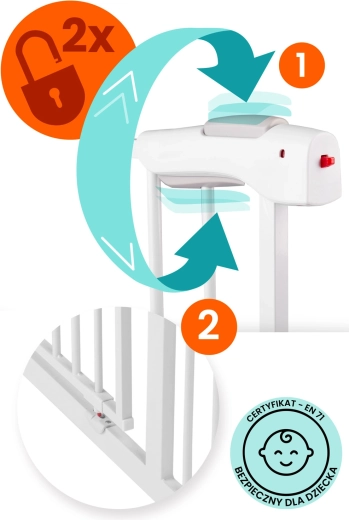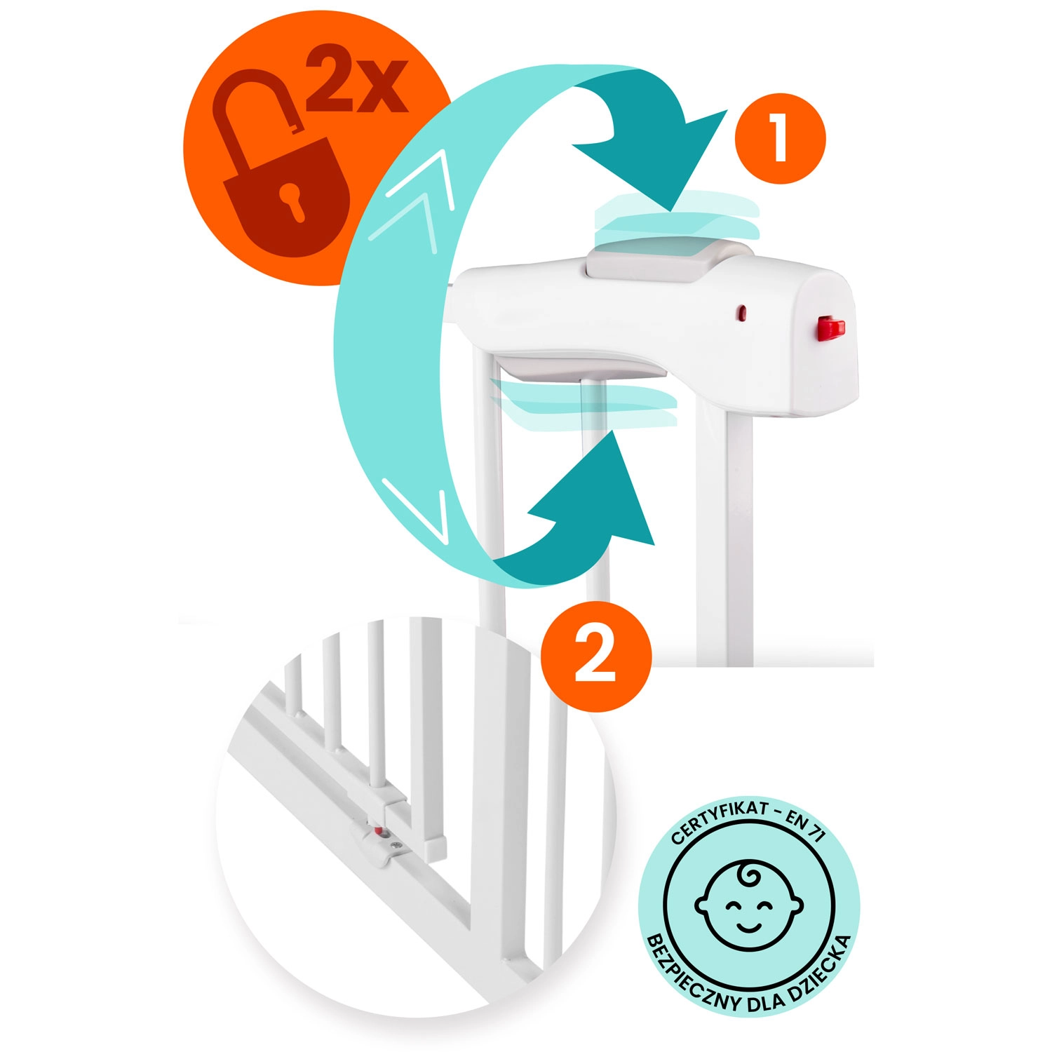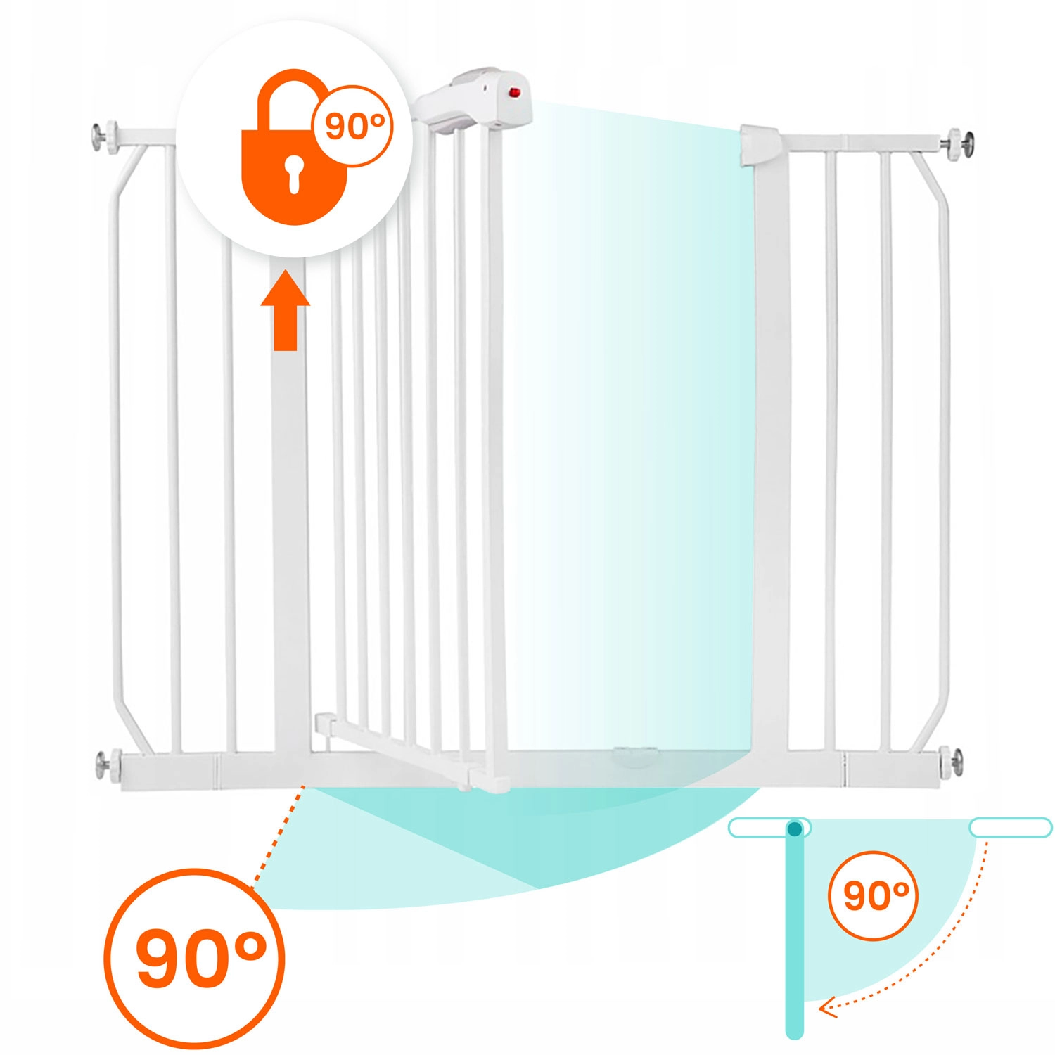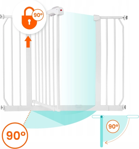 De bediening is ontworpen voor volwassenen: dubbele vergrendeling vereist het indrukken van de bovenste en vervolgens de onderste knop, wat voor kinderen lastig is maar voor u intuïtief. Het hekje kan met één hand worden geopend, sluiten is soepel en stil. Dankzij tweerichtingsopening en de mogelijkheid tot vergrendeling in een hoek van 90° is de doorgang altijd comfortabel.