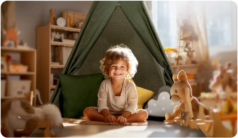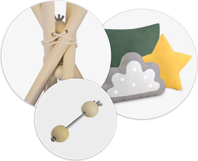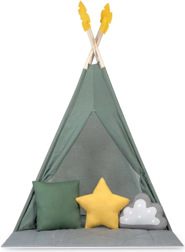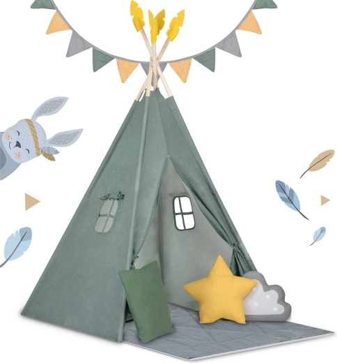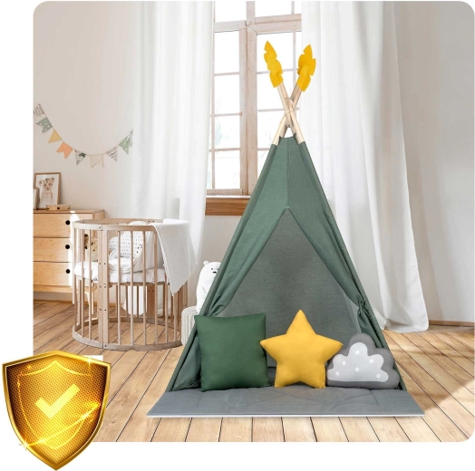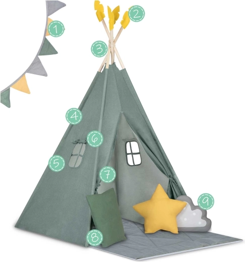 De Nukido kinder-tipi is een knus speelhoekje dat natuurlijk in de kinderkamer past. De mix met premium katoen met een hoge grammage van 175 g/m2 is ademend, zacht en sterk, en kan dus tegen dagelijkse avonturen. De harmonieuze groene kleur met speelse accenten ondersteunt de sensorische ontwikkeling en prikkelt de fantasie.