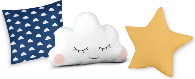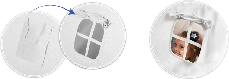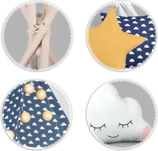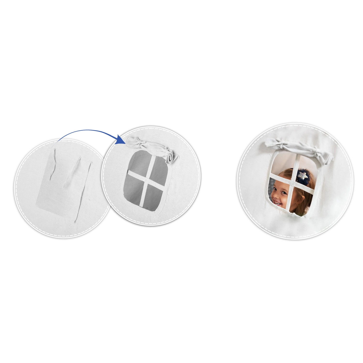 De set bevat een dikke, zachte mat met antislipafwerking, die ook los als vloerkleed kan worden gebruikt. Drie kussens in speelse vormen (wolkje, ster en patroon) verhogen het comfort en sieren de kinderkamer. Praktische details zoals wegschuifbare frontflappen en een raampje met rolgordijn ondersteunen het spel en tegelijk de ventilatie.