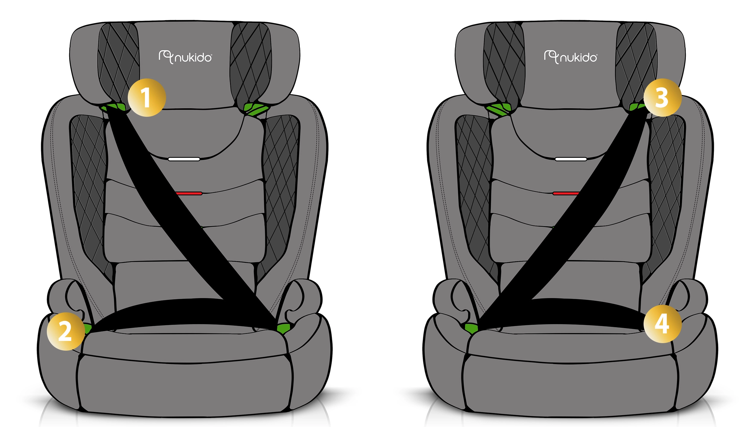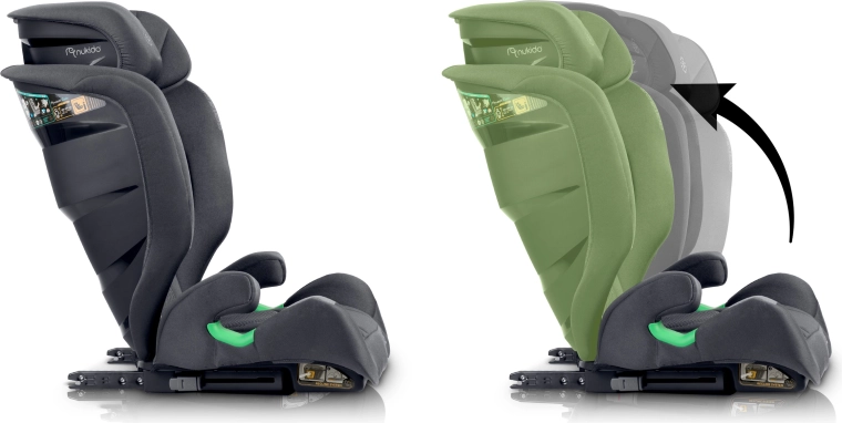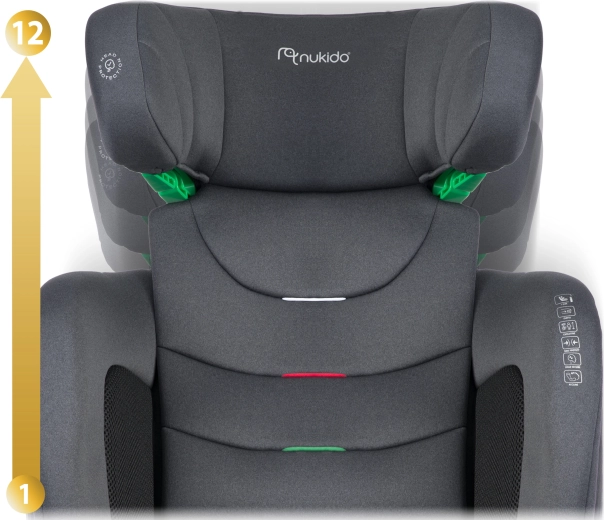 Fijnafstelling van de hoogte van de hoofdsteun in 12 stappen voor een ideale gordelpositie en comfort van ca. 4 tot 12 jaar.