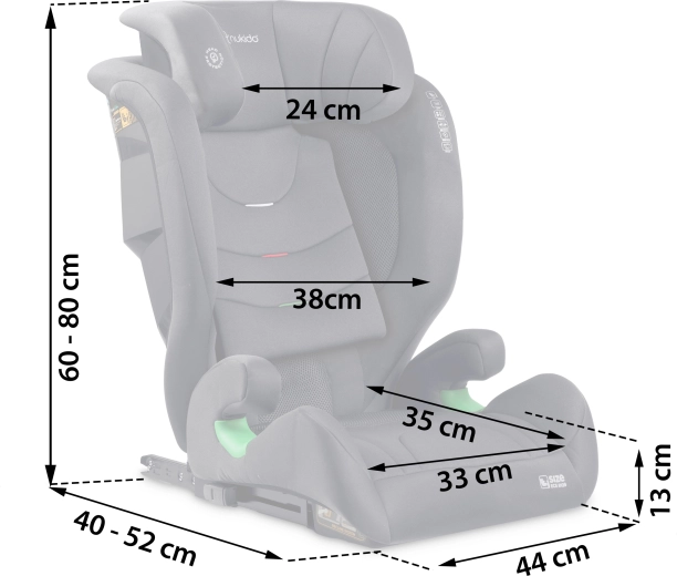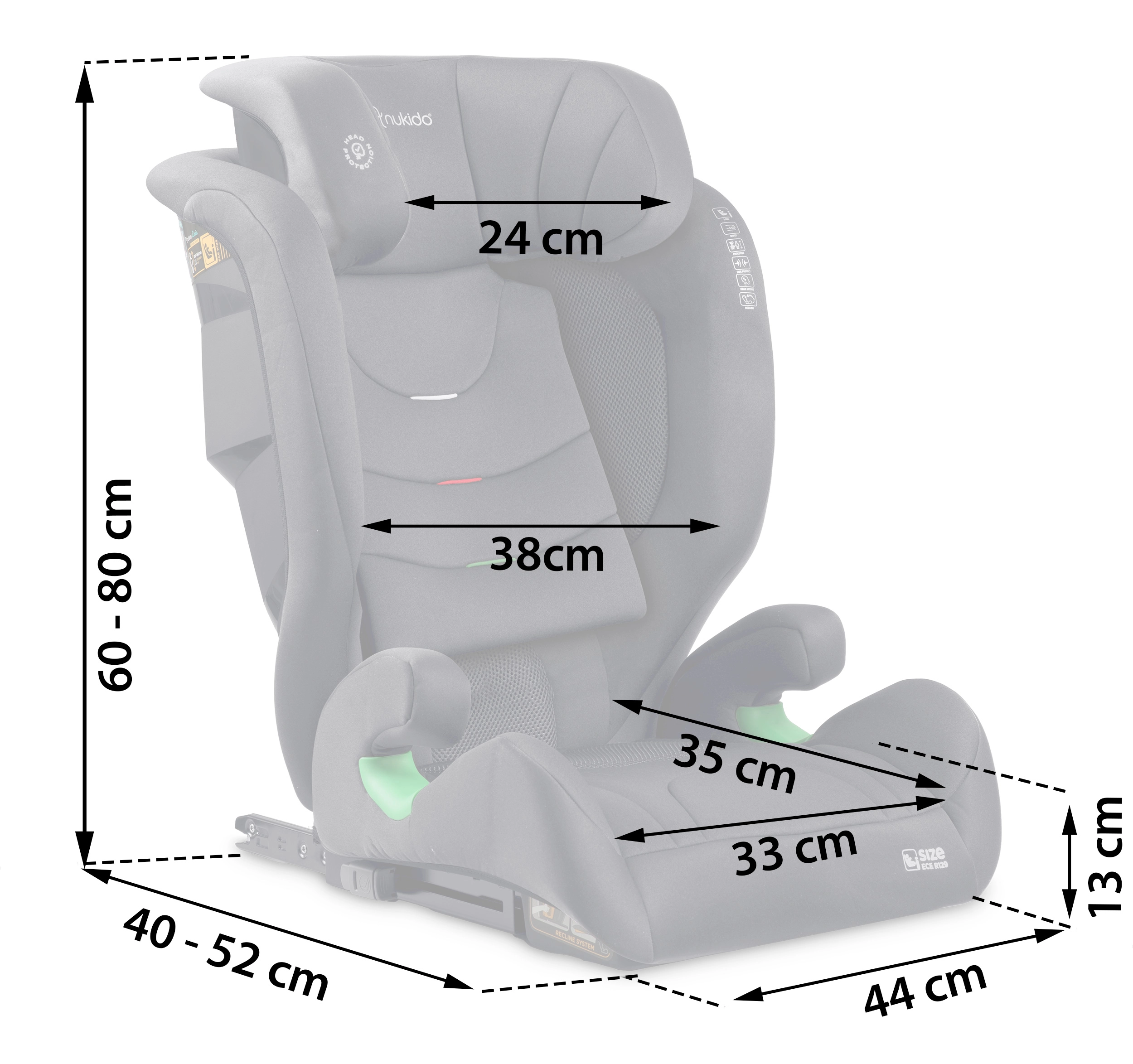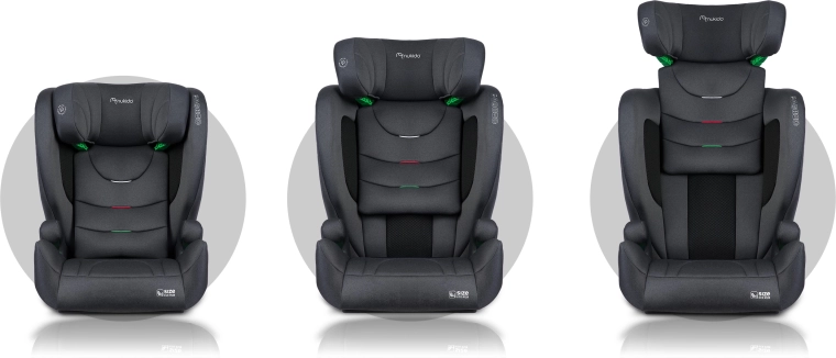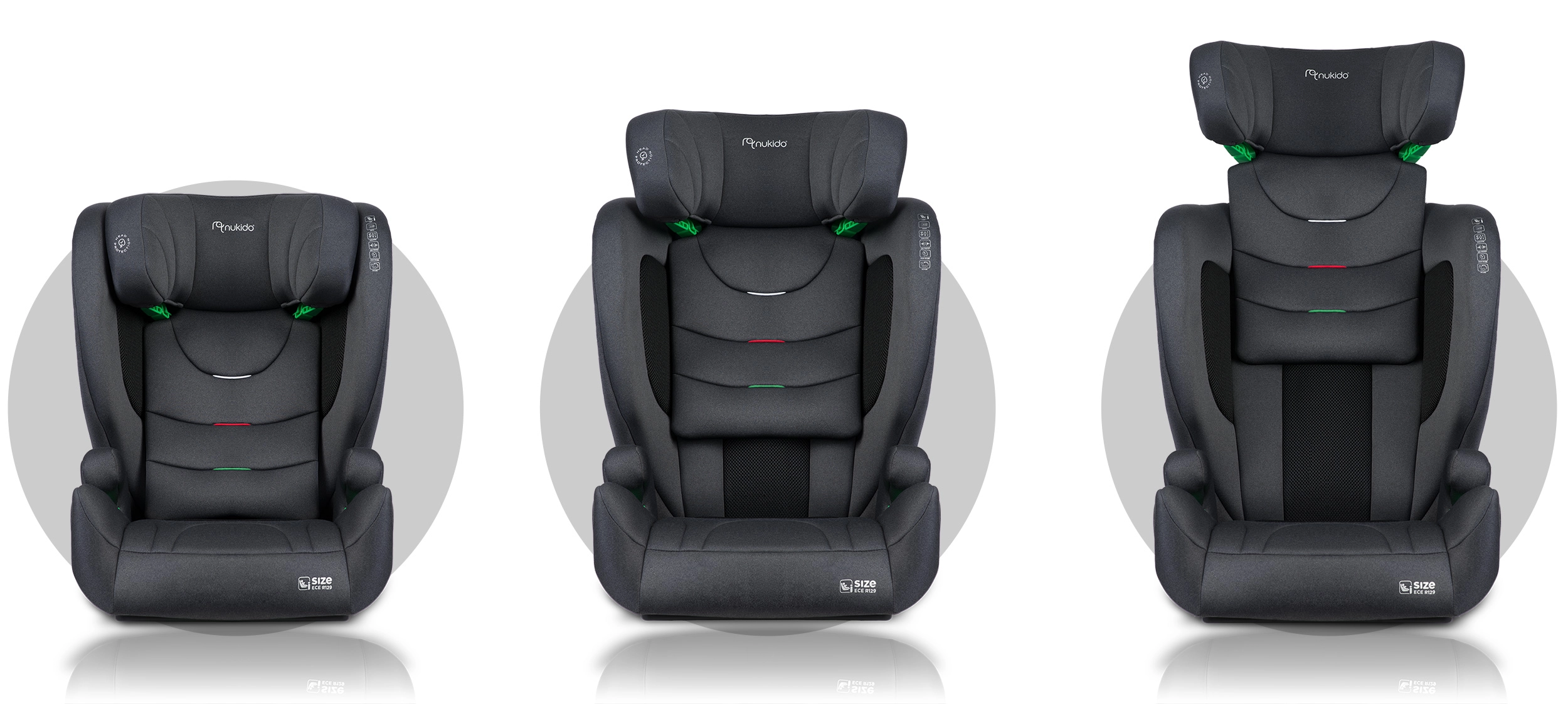 De stoel is ontworpen voor groeiende kinderen: 12 niveaus van hoofdsteunhoogte maken een precieze afstelling mogelijk volgens de actuele lengte van het kind in het bereik van 100–150 cm. Wanneer het kind groter wordt, kan de stoel met hoge rugleuning gebruikt worden of later alleen als zitverhoger. De afneembare en wasbare hoes maakt het onderhoud eenvoudig, zodat de stoel schoon en fris blijft.