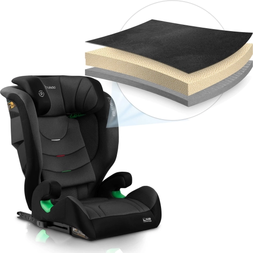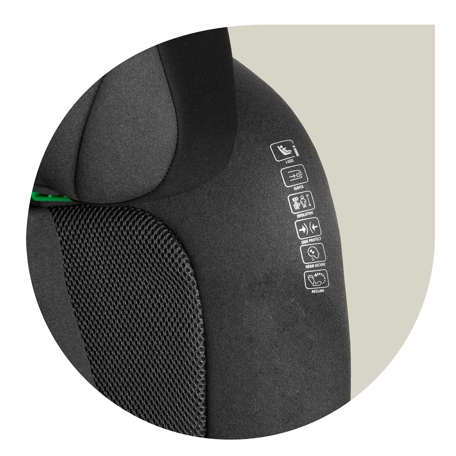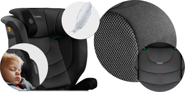 De zijdelingse bescherming SIP en materialen met zijbuffers absorberen effectief energie bij een impact. Ademende en zachte bekleding met dichte schuimvulling en een gevormde EPS-kern verhogen het comfort, ook op langere ritten. De hoes kan eenvoudig worden verwijderd en gewassen, zodat het stoeltje schoon en fris blijft.