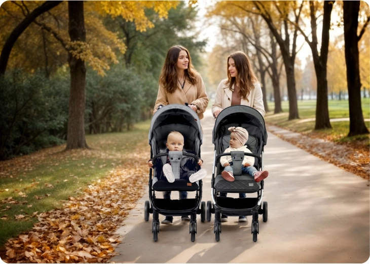 Zwenkbare voorwielen met afzonderlijke vering en grote achterwielen nemen moeiteloos stadsoneffenheden en parkpaden. Je krijgt uitstekende wendbaarheid in bochten en comfort voor je kind.