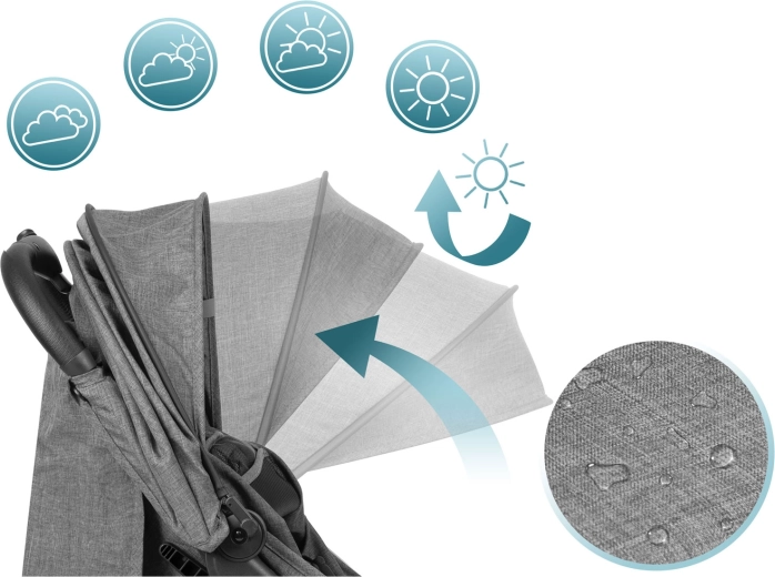 De kap met meerdere standen beschermt tegen zon en wind; de waterafstotende stof houdt motregen tegen. Klap hem verder uit wanneer je kind slaapt of zet hem omhoog voor beter zicht.