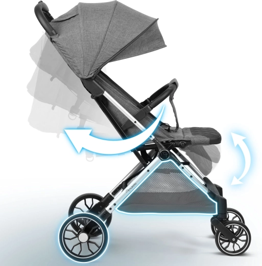 De kap met meertrapsinstelling biedt bescherming tegen zon, wind en lichte regen, terwijl de gepolsterde 5-puntsgordel en de afneembare veiligheidsbeugel zorgen voor veiligheid en comfort. Een verstelbare rugleuning tot ligstand en een verstelbare beensteun laten kinderen rusten en slapen tijdens langere wandelingen. Onderhoud wordt eenvoudiger dankzij de PU eco-leer voetsteun, bestand tegen vocht en vlekken.