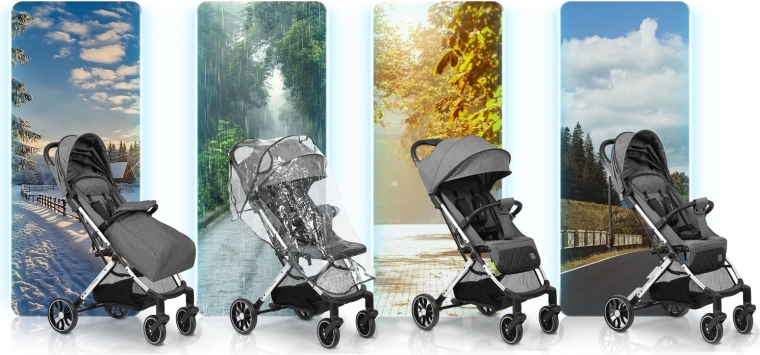 - Het hele jaar door te gebruiken: regenhoes en voetenzak inbegrepen, waterafstotende stof.