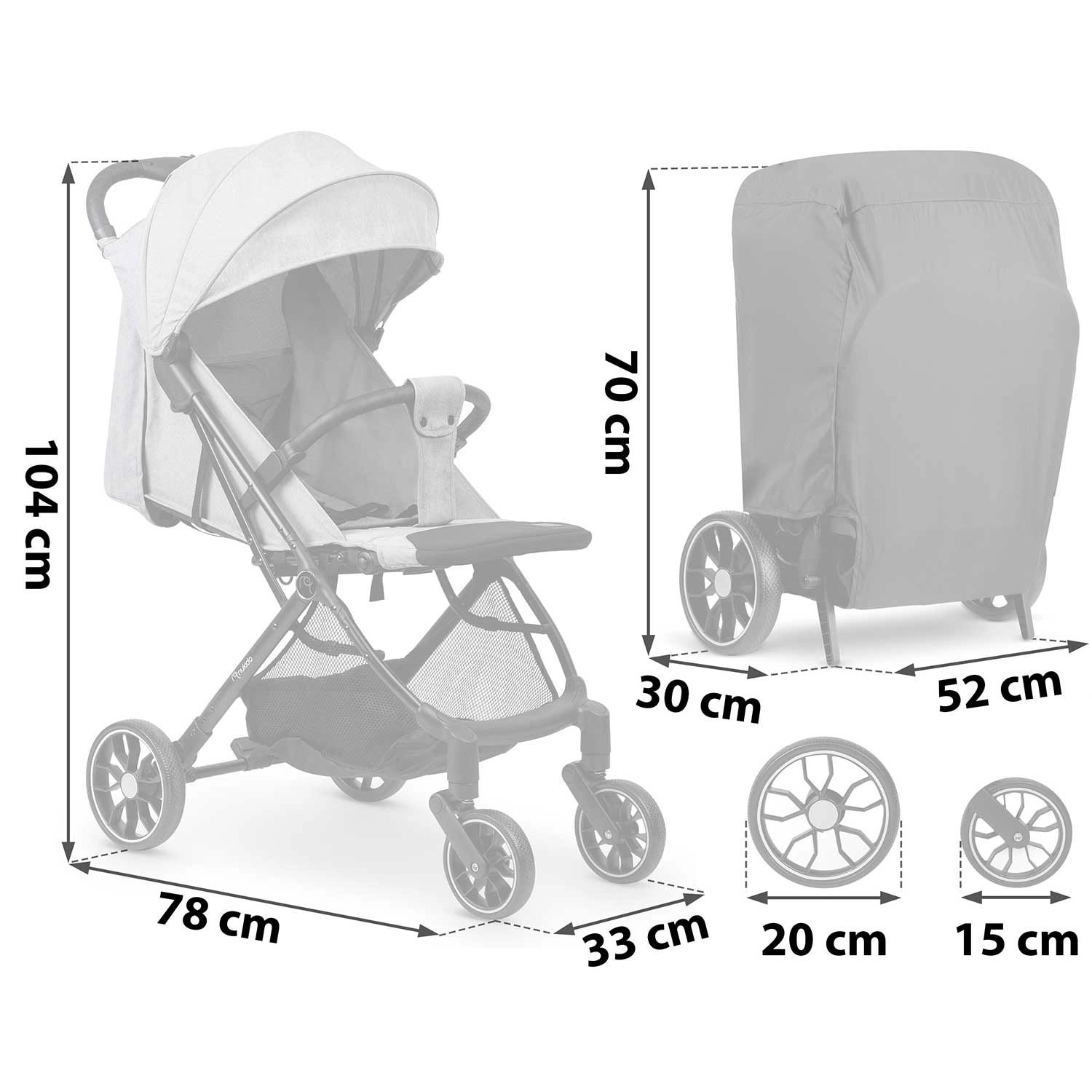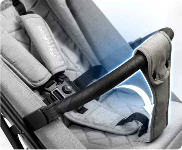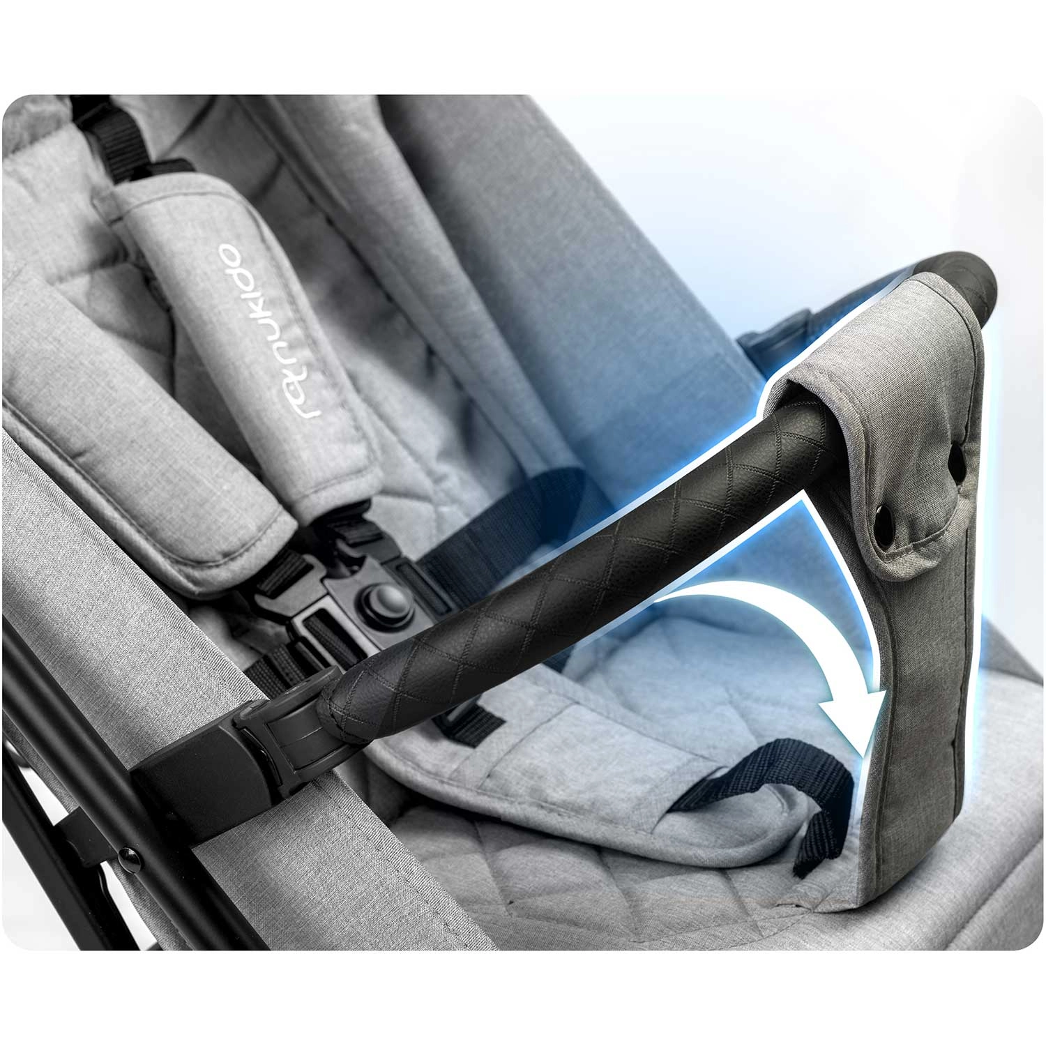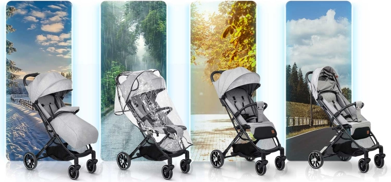 De praktische uitrusting omvat een ruime mand onder de zitting, een afneembare veiligheidsbeugel voor gemakkelijk in- en uitstappen, regenhoes en voetenzak inbegrepen en veilige, zachte textielen die prettig aanvoelen. De grote kap met uitbreidingsmogelijkheid beschermt tegen zon, wind en lichte regen en past zich aan of je kind slaapt of de wereld om zich heen bekijkt.