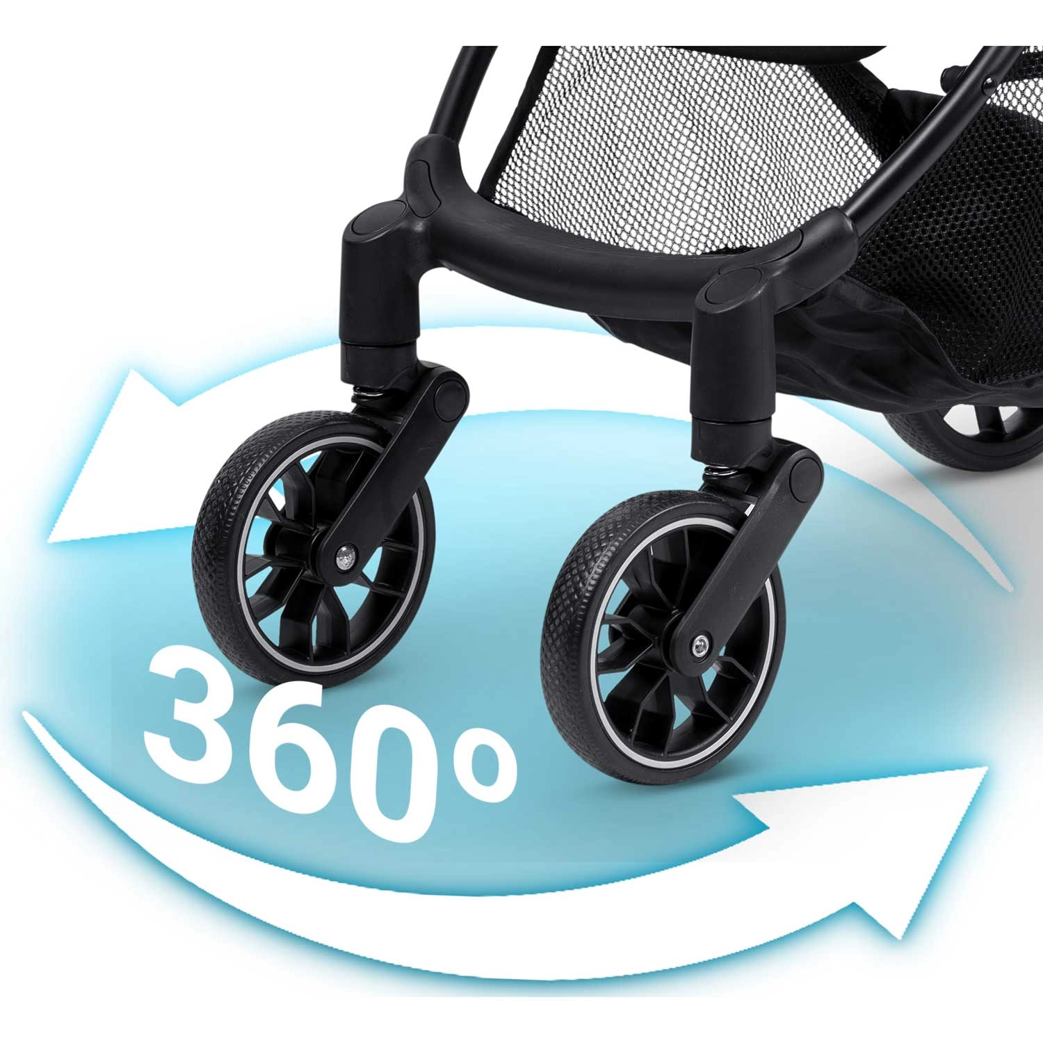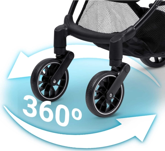 Eenvoudig manoeuvreren in krappe ruimtes en een soepele rit op oneffenheden. De vering vermindert schokken voor extra comfort en bescherming van je kind.