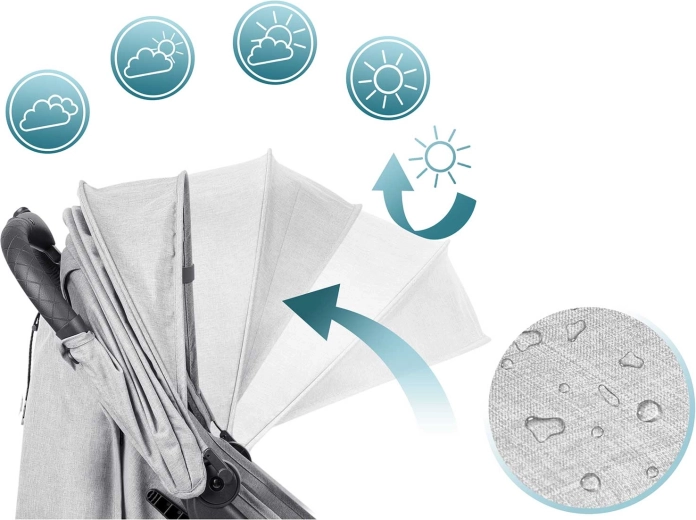 Stel de mate van schaduw in naar het weer en moment van de dag. De kap beschermt tegen zon, wind en lichte regen en verhoogt het comfort tijdens slapen of het bekijken van de omgeving.