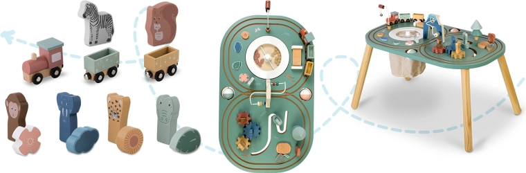 - Multifunctioneel centrum: magnetisch treintje, knikkerbaan, tandwielen, doolhoven, belletje en sorteerkubussen.