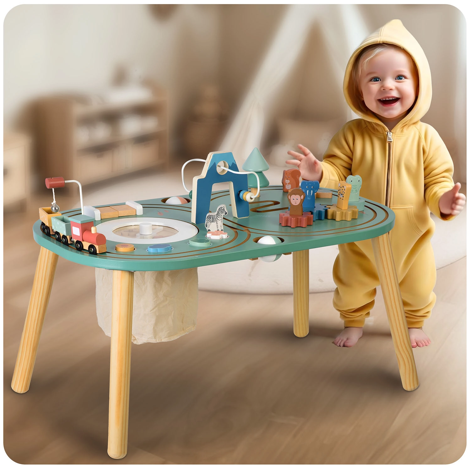 Ontdek de veelzijdige houten NUKIDO activiteitentafel met een treintje, knikkerbaan, doolhoven en tandwielen, die fijne motoriek, zintuiglijke waarneming en leren door spel volgens de principes van Montessori stimuleert. Gemaakt van hoogwaardig hout en geverfd met veilige verven, biedt hij een lange levensduur, een elegant design en een praktische textielen opbergzak voor onderdelen direct onder het tafelblad.