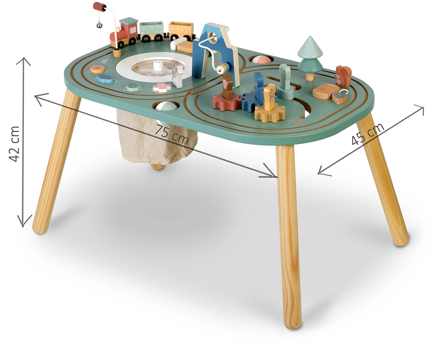 De tafel is gemaakt van natuurlijk hout met gladde, afgeronde randen en afgewerkt met veilige, niet-schadelijke verven. De minimalistische look in gedempte kleuren past in een modern interieur en dankzij de stabiele constructie is hij bestand tegen dagelijks spel. De praktische geweven zak onder het blad helpt de orde te bewaren – na het spelen kan alles eenvoudig worden opgeborgen.