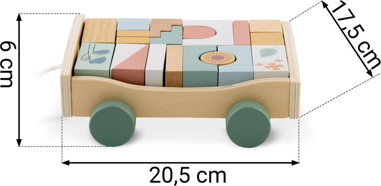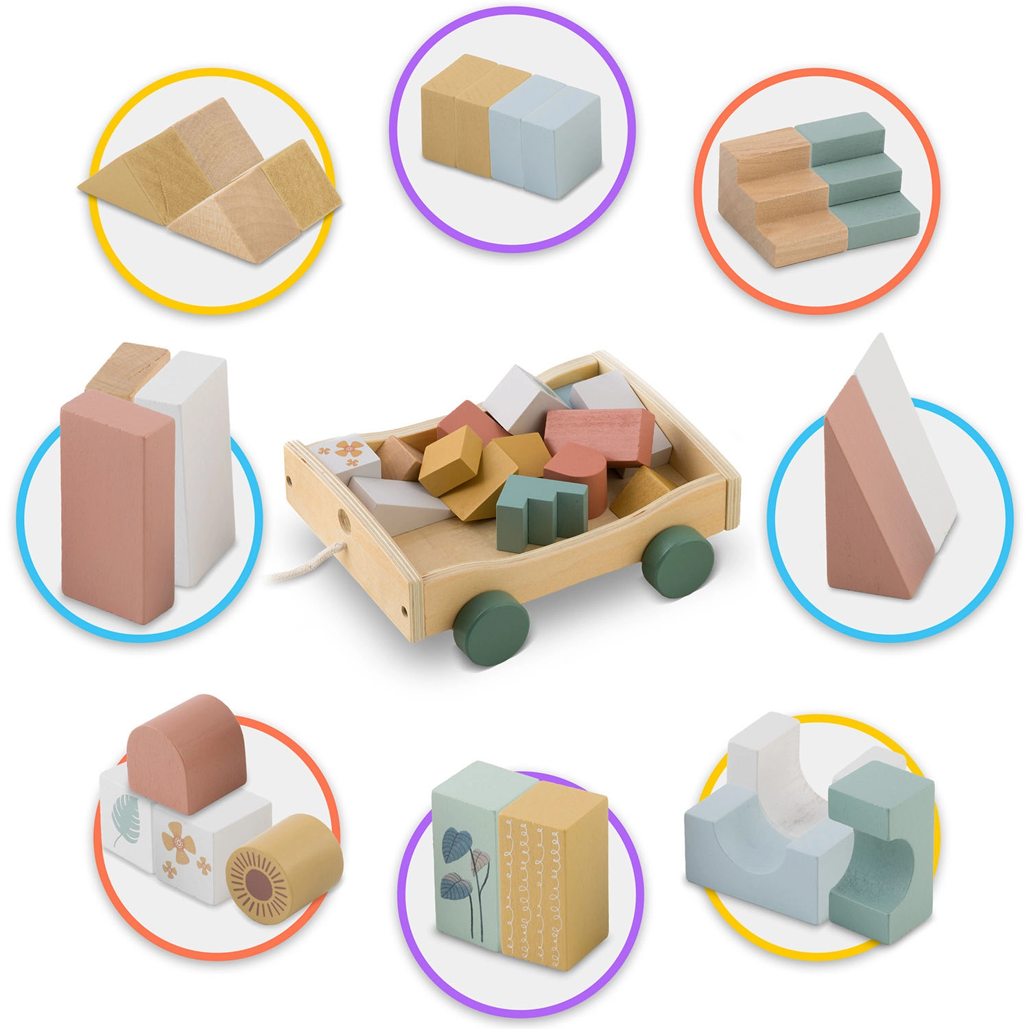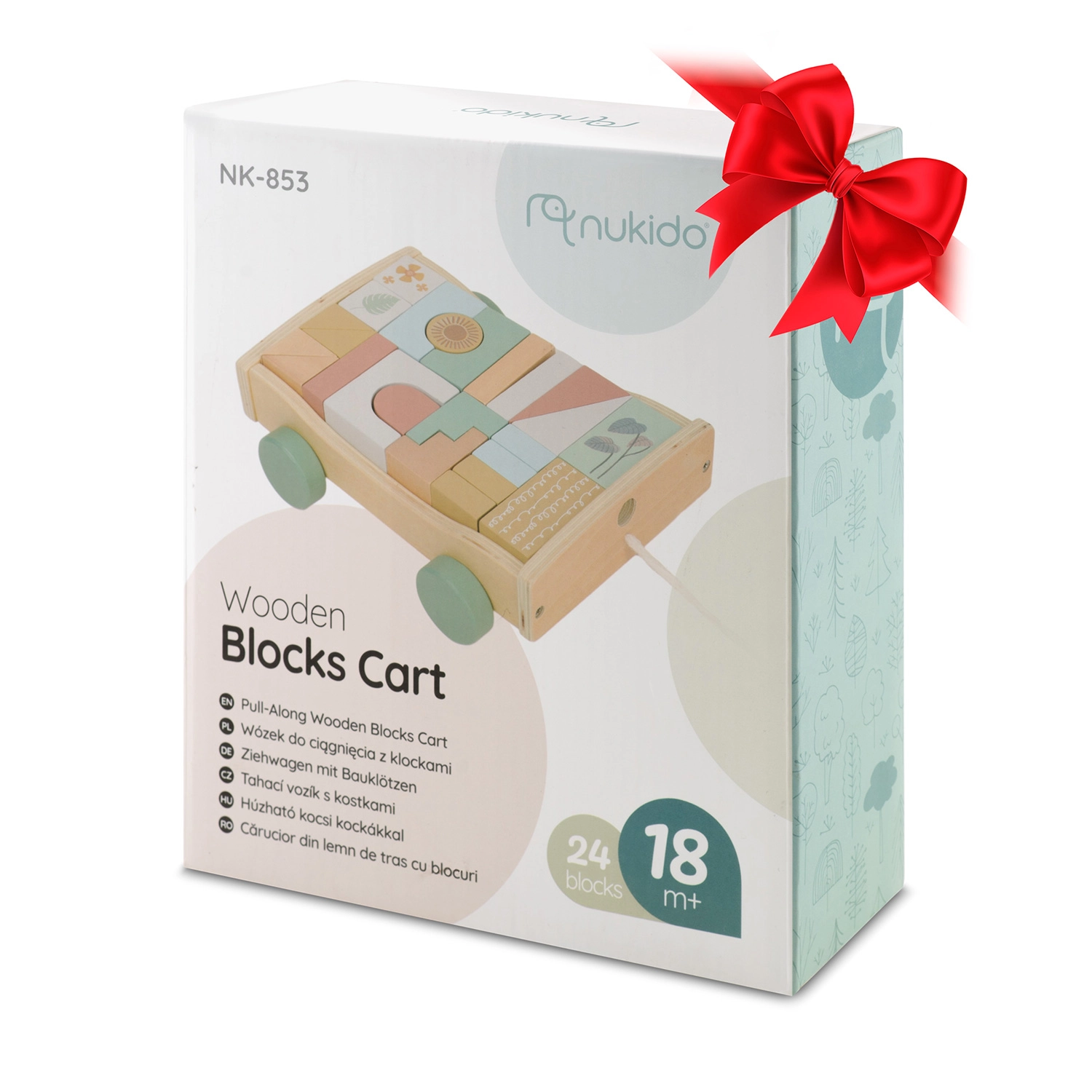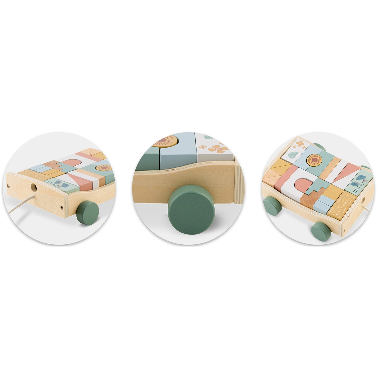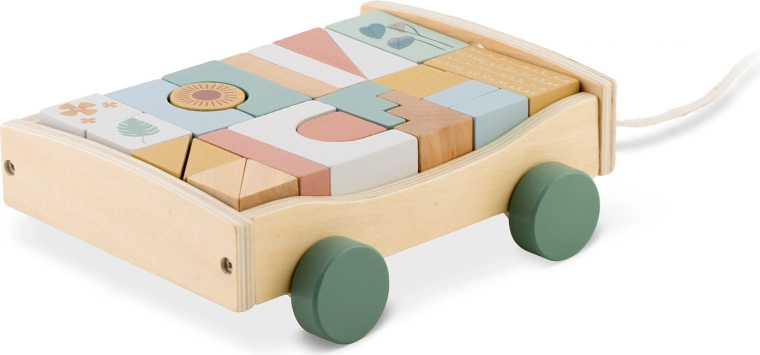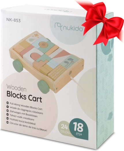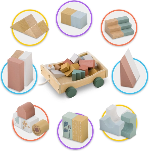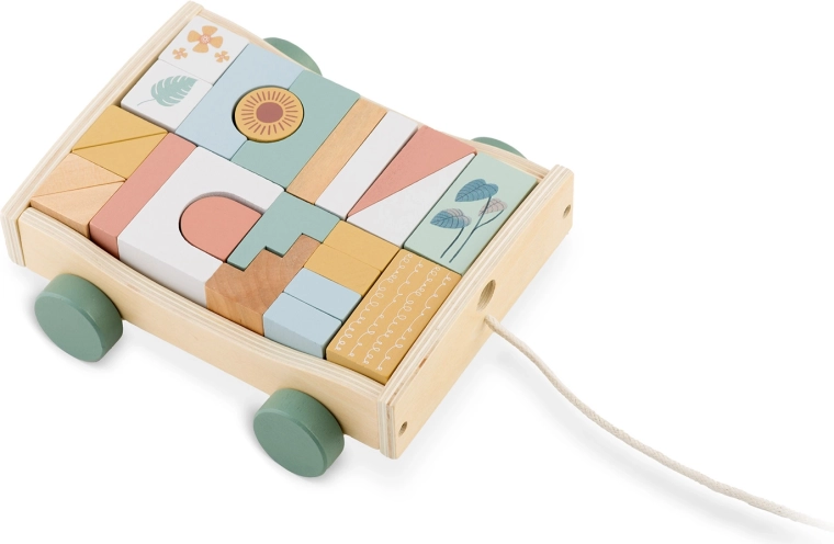 Ontdek de houten wagen met pastelgekleurde blokken die kinderen gemakkelijk aan een touwtje kunnen voorttrekken. Het speelgoed combineert ontwikkeling van fijne en grove motoriek, zintuiglijke stimulatie en creatief bouwen volgens de principes van Montessori. Glad hout, afgeronde randen en de hoogwaardige afwerking van NUKIDO zorgen voor veilig en leuk spel, waarbij kinderen coördinatie, balans en het herkennen van vormen oefenen.