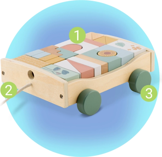 Geïnspireerd door Montessori – kinderen leren oorzaak en gevolg bij het voorttrekken van de wagen, sorteren van vormen en kleuren tijdens het stapelen en bouwen, en ontwikkelen fijne motoriek door te grijpen en blokken precies neer te leggen. Het spel vereist geen batterijen, stoort niet met melodietjes en bevordert op natuurlijke wijze de concentratie.