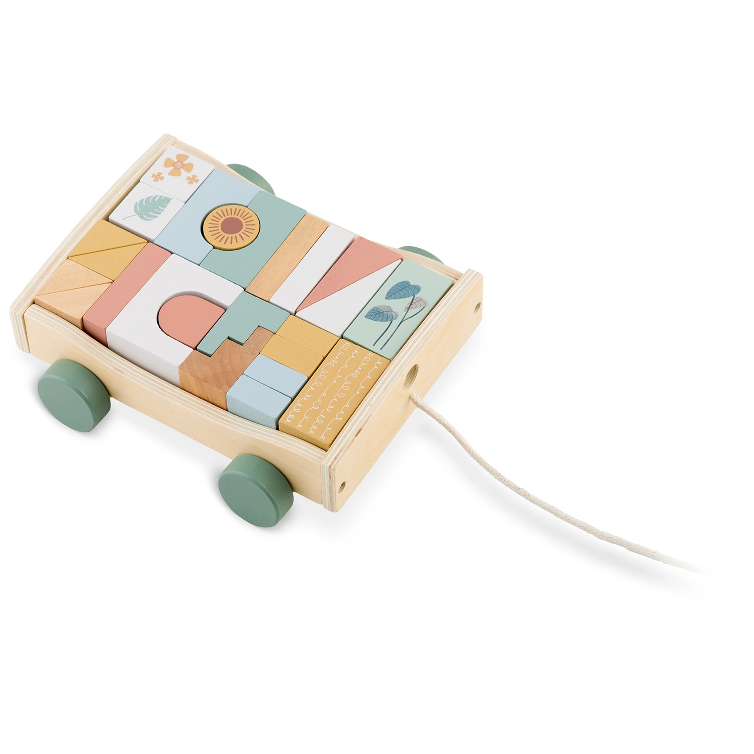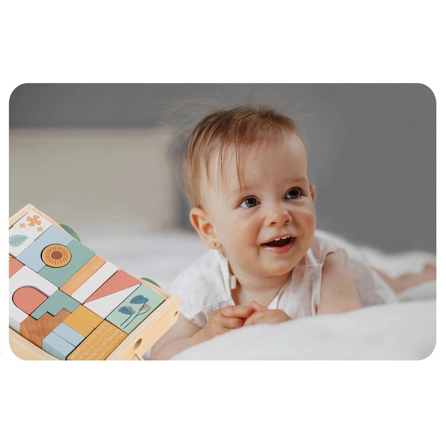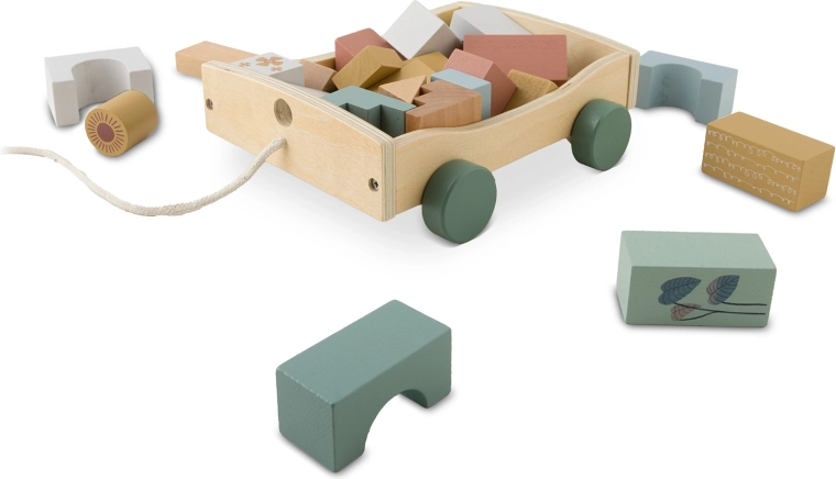 De houten wagen met blokken van NUKIDO is een tijdloos speelgoed voor dagelijks ontdekken. Dankzij het praktische koord en de soepel rollende wielen nemen kinderen hem makkelijk mee, terwijl alle onderdelen binnenin de wagen netjes bij elkaar blijven. Pasteltinten, prints en gevarieerde vormen stimuleren de fantasie, zelfstandig spel en zintuiglijke ontwikkeling.