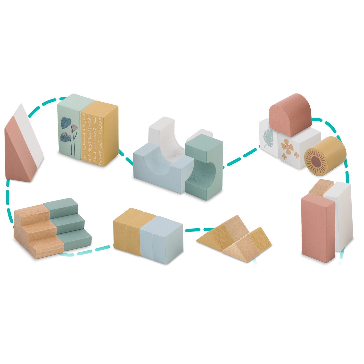Verschillende vormen, prints en kleuren stimuleren de fantasie, het ruimtelijk inzicht en het herkennen van vormen. De gladde houten onderdelen liggen prettig in kleine handjes.