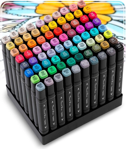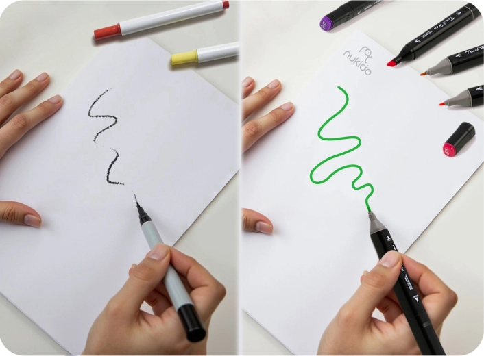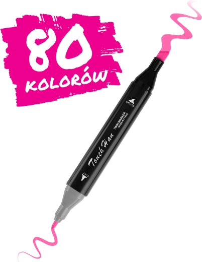De set van 80 NUKIDO-markers is ontworpen voor kunstenaars, studenten en hobbycreators die een professioneel resultaat willen behalen. Twee punten in één behuizing – fijn ca. 2 mm voor gedetailleerde lijnen en afgeschuind ca. 7 mm voor snel inkleuren – geven volledige controle over elke streek. De alcoholinkt droogt snel, veegt na droging niet uit en creëert vloeiende toonovergangen zonder strepen.