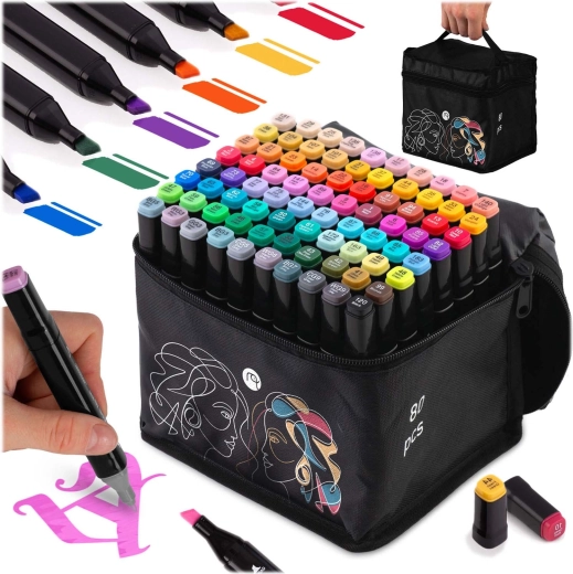 Ontdek de veelzijdige set van 80 NUKIDO alcoholmarkers met dubbele punt voor illustraties, kalligrafie en kleurrijke schetsen. Ze bieden intense, rijke kleuren, egale dekking en sneldrogende alcoholinkt met een duurzaam, waterbestendig resultaat. De praktische ritsetui met handgreep zorgt voor overzichtelijke opslag en makkelijk meenemen van het volledige palet aan tinten.