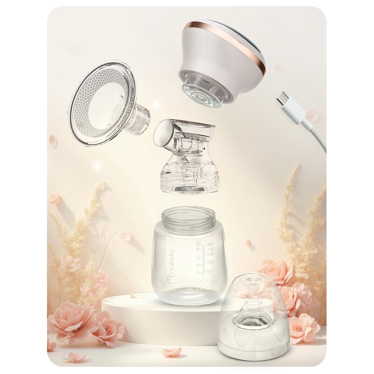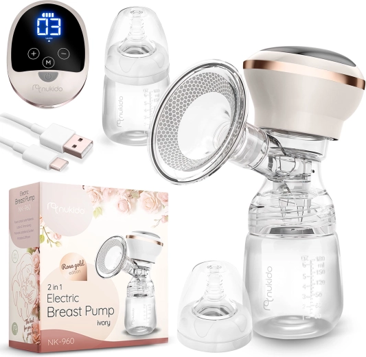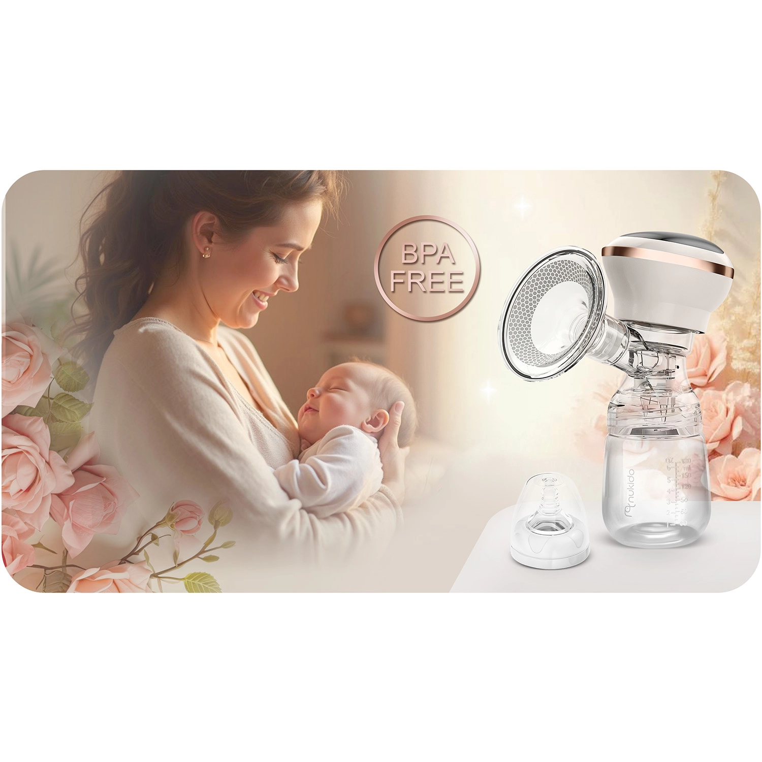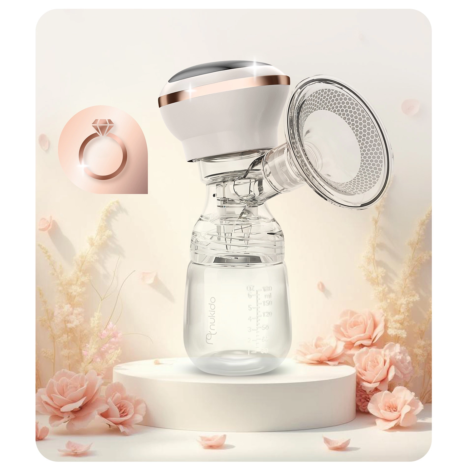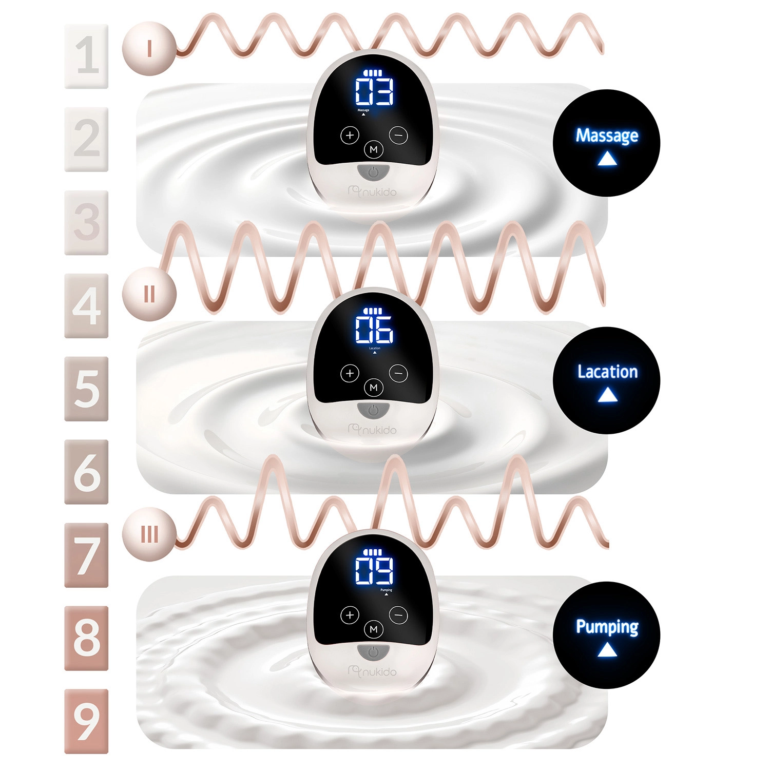 De Nukido‑borstkolf bootst natuurgetrouw het natuurlijke zuigritme van de baby na voor efficiënt en zacht afkolven. Drie modi (stimulatie, zuigen, diepe afkolving) en 9 instelbare niveaus laten u de kracht aanpassen aan uw behoeften zonder pijn. De massage‑inzet van siliconen met zachte touch ondersteunt de toeschietreflex en verhoogt het comfort, ook bij langer gebruik.