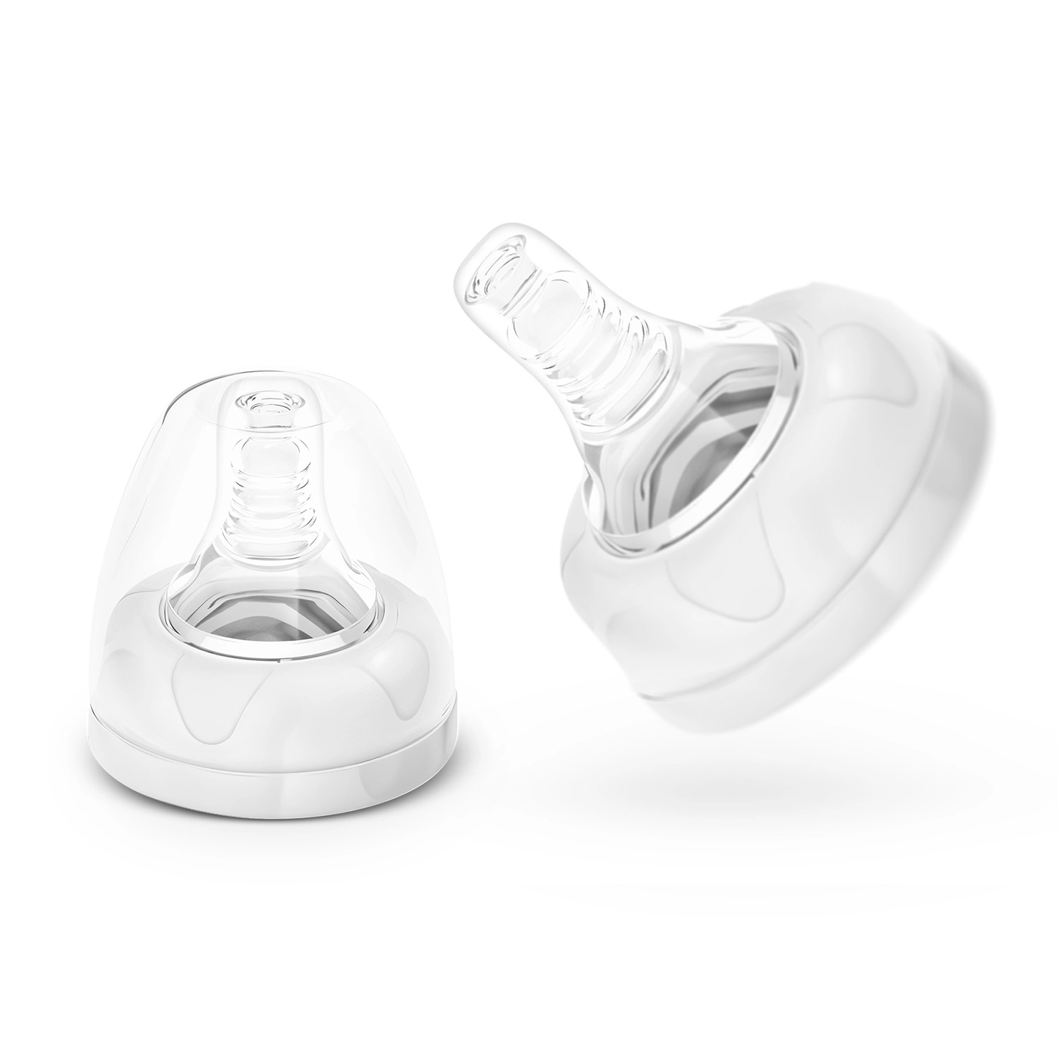 De zachte massage‑inzet van fijn siliconen verhoogt het comfort en ondersteunt de melkstroom. De 180 ml fles met dynamische speen verstoort de borstvoeding niet.