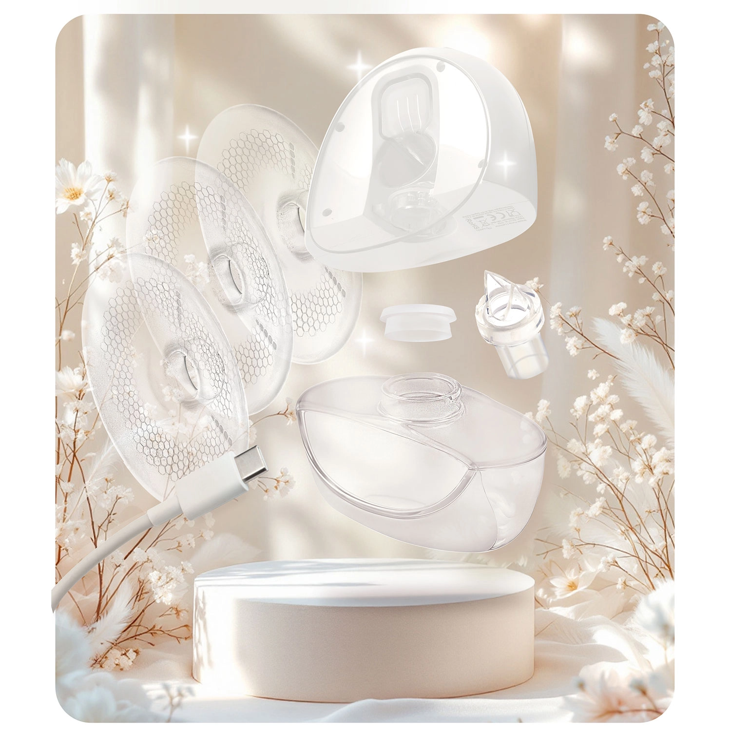 - Massagerand met stofkap, behuizing met motor en LED-display, siliconenmembraan, kabel met adapter, clip voor bh-aanpassing, 150 ml flesje, dop