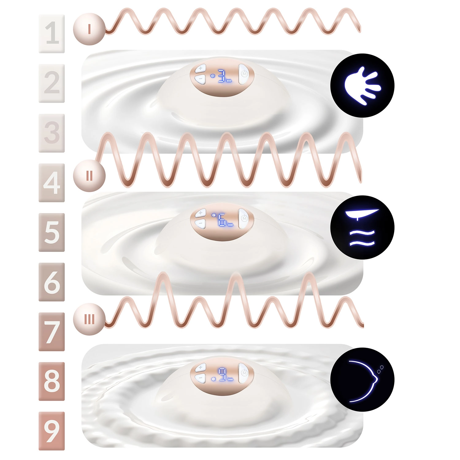 - 9 intensiteitsniveaus in elke fase – zachte tot krachtigere instellingen naar behoefte.