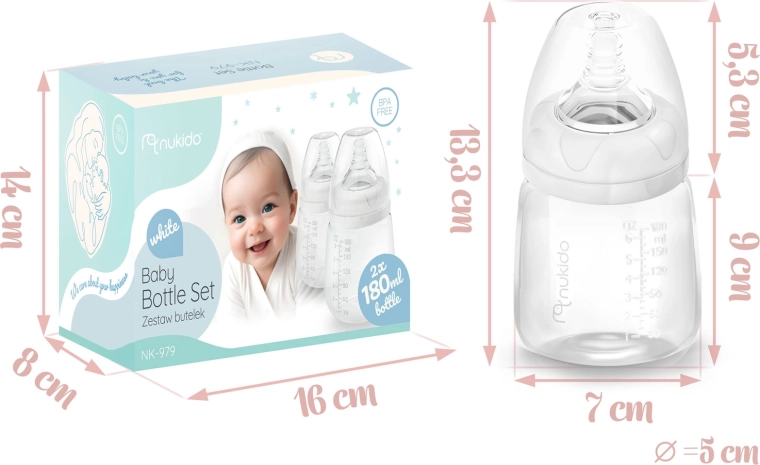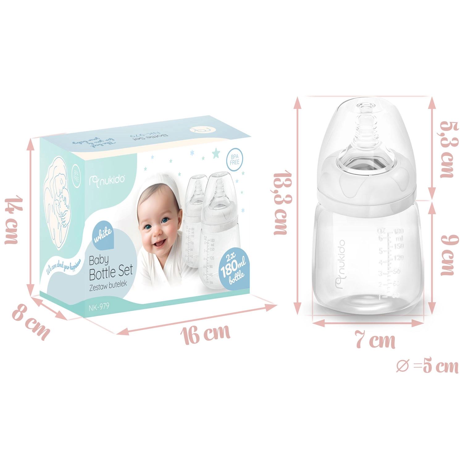 Praktische set van twee babyflessen van 180 ml van veilig polypropyleen voor dagelijks voeden. De flesjes zijn licht, liggen prettig in de hand en hebben duidelijke maatstrepen, een wijde hals voor eenvoudig schoonmaken en een dynamische siliconen speen die de beweging van de tepel nabootst. Ze zijn BPA-vrij, compatibel met NUKIDO-kolfapparaten en kunnen in de vaatwasser en met de hand worden gereinigd.